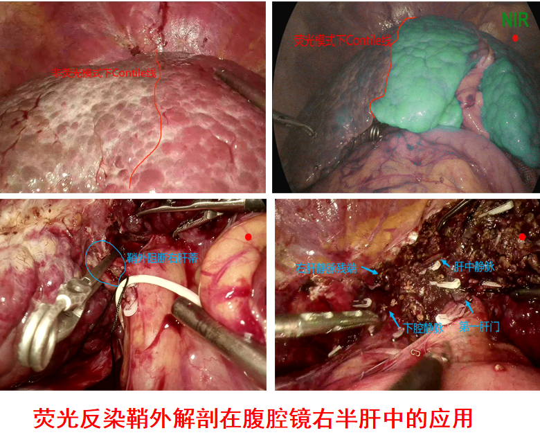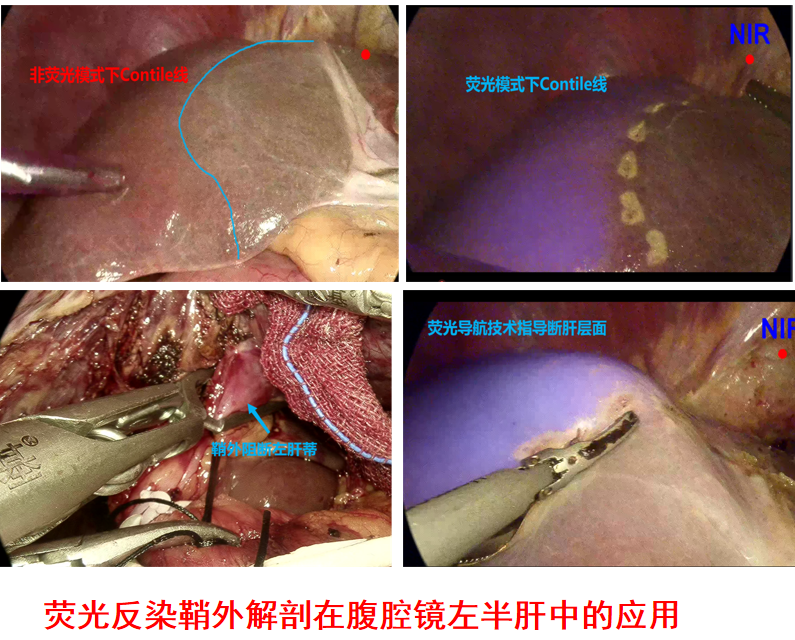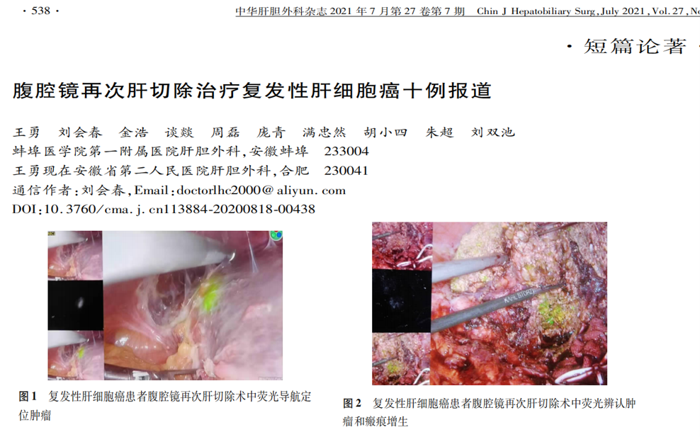 省内领先技术2:荧光导航技术在腹腔镜肝切除中的应用:荧光导航技术是采用特殊荧光示踪剂对特定组织进行靶向标记,近年来以其精确的术中可视化特点,在腹腔镜肝切除中已逐步开展应用,其不仅能精准识别肿瘤、发现微小肿瘤、判断肝切除边界、实时手术导航保证手术完整切除,还可初步判断肿瘤分化类型。本中心已常规将该技术运用于腹腔镜肝切除和腹腔镜再次肝切除,取得良好效果。
