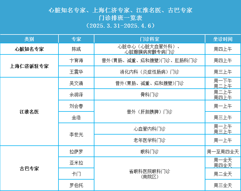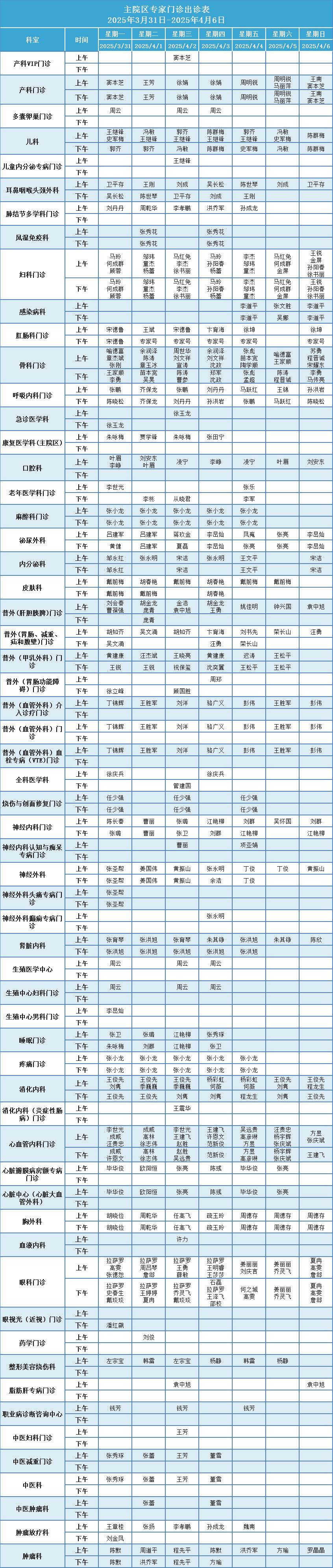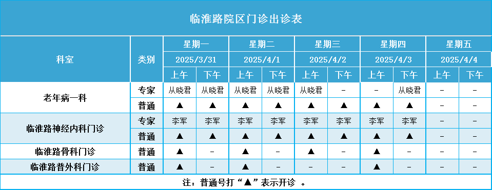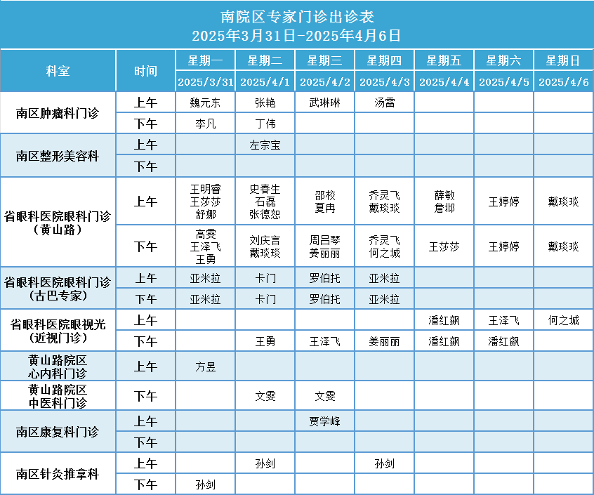 安徽省第二人民医院门诊一周排班表(2025年3月31日-2025年4月6日)