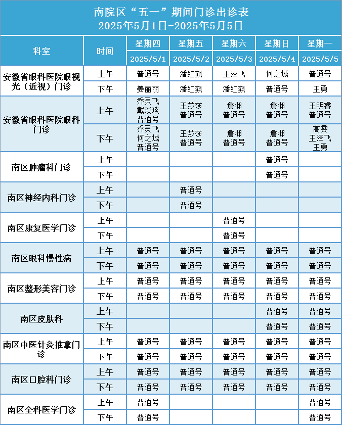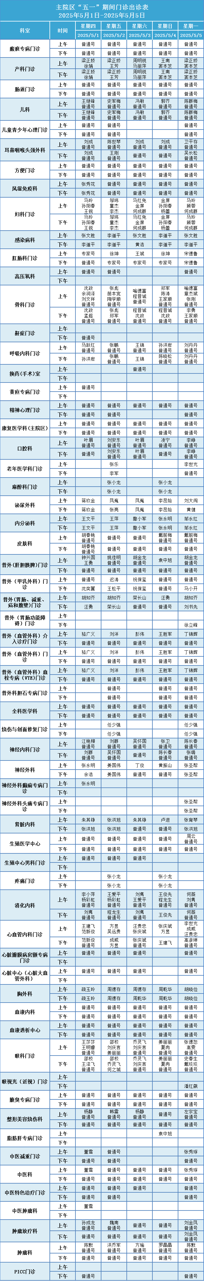 “五一”假期(5月1日-5月5日),我院(主院区、南院区)继续实行无假日门诊,各医技检查正常开展,在此期间预约诊疗工作正常进行。急诊绿色通道24小时开放,各类常规检查正常开展,部分特殊检查需提前预约。