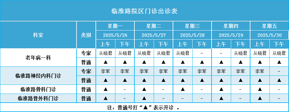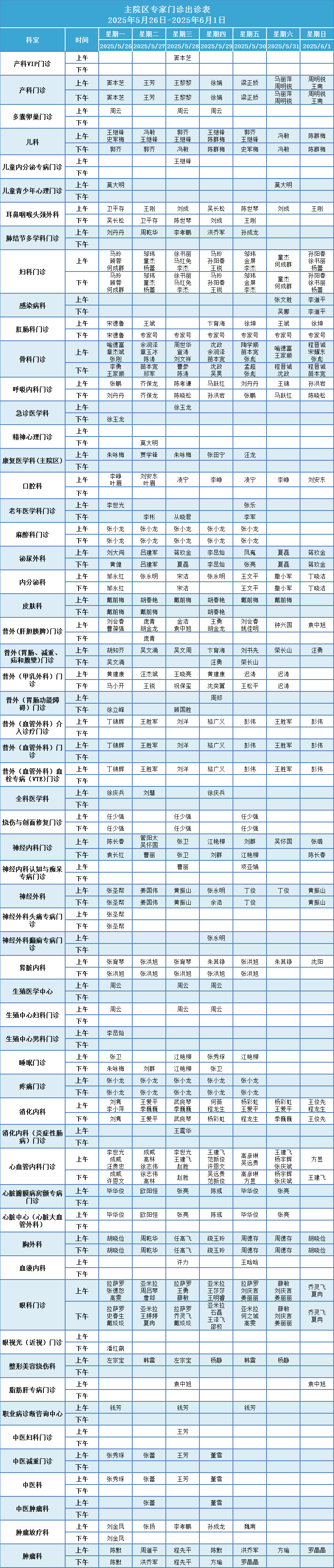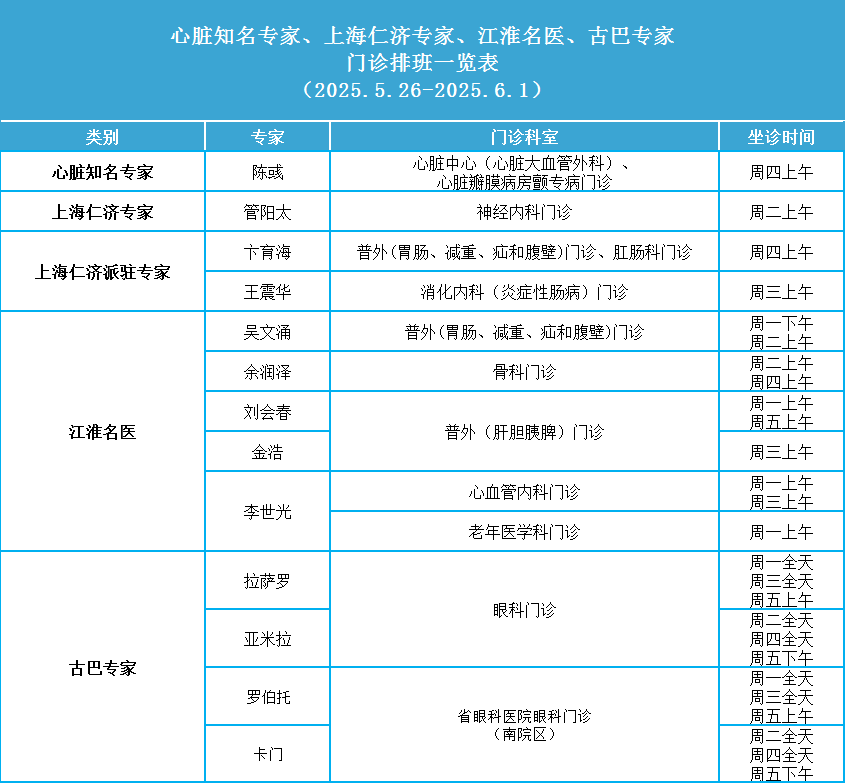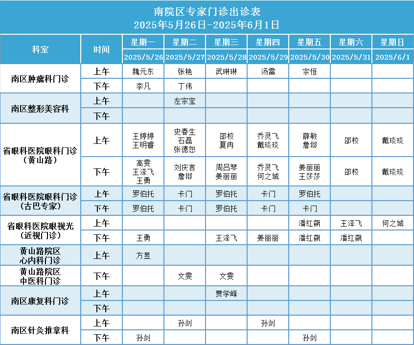 安徽省第二人民医院门诊一周排班表(2025年5月26日-2025年6月1日)