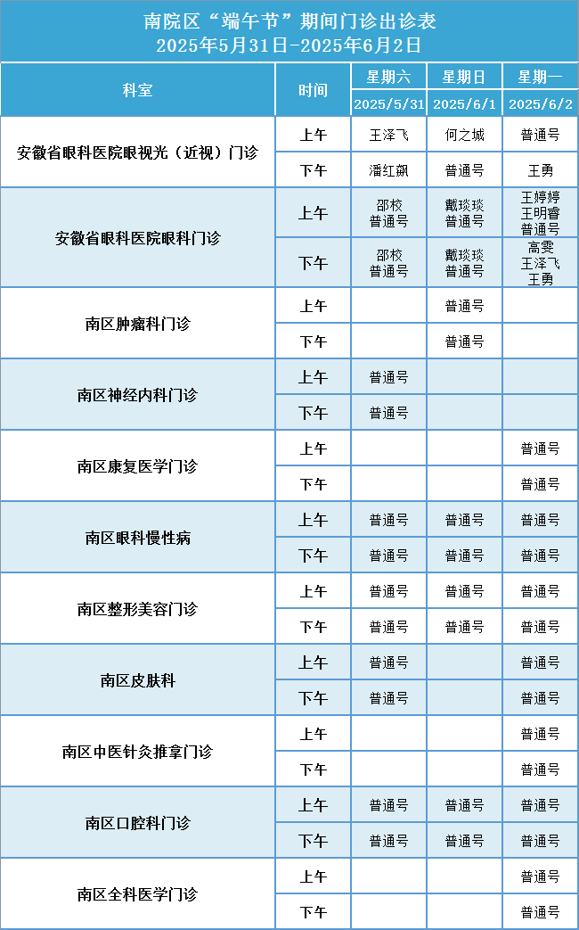 2025年“端午节”假期(5月31日—6月2日),我院(主院区、南院区)继续实行无假日门诊,各医技检查正常开展,在此期间预约诊疗工作正常进行。急诊绿色通道24小时开放,各类常规检查正常开展,部分特殊检查需提前预约。