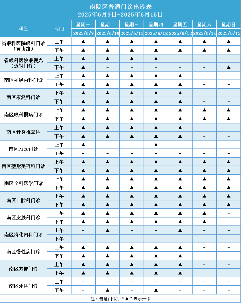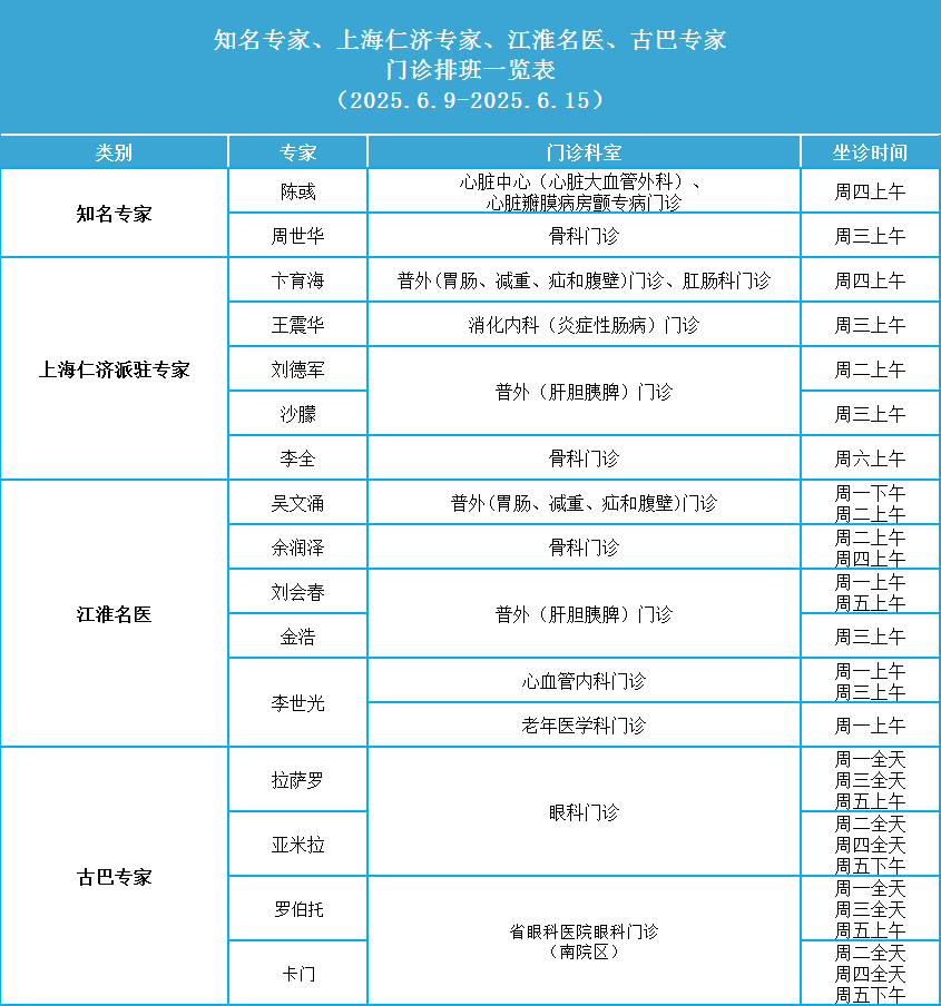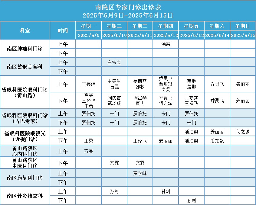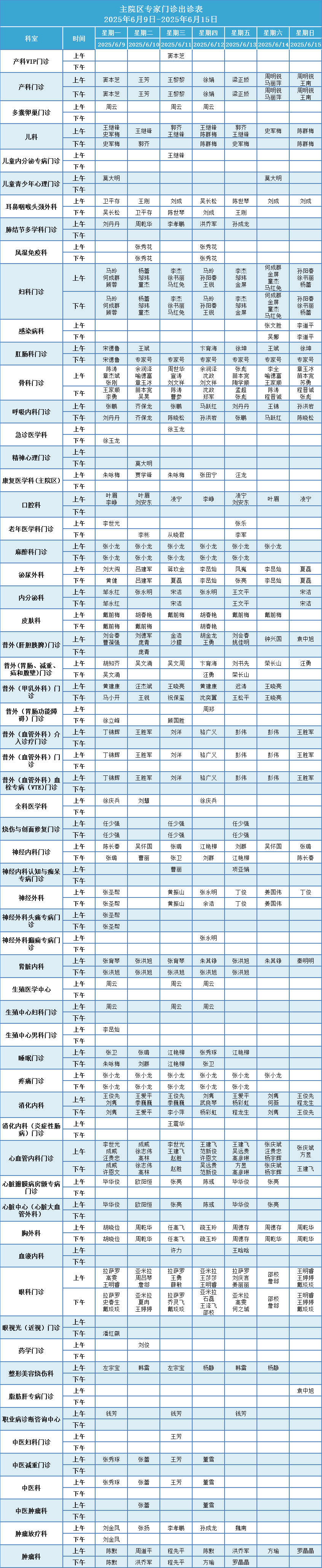 安徽省第二人民医院门诊一周排班表(2025年6月9日-2025年6月15日)
