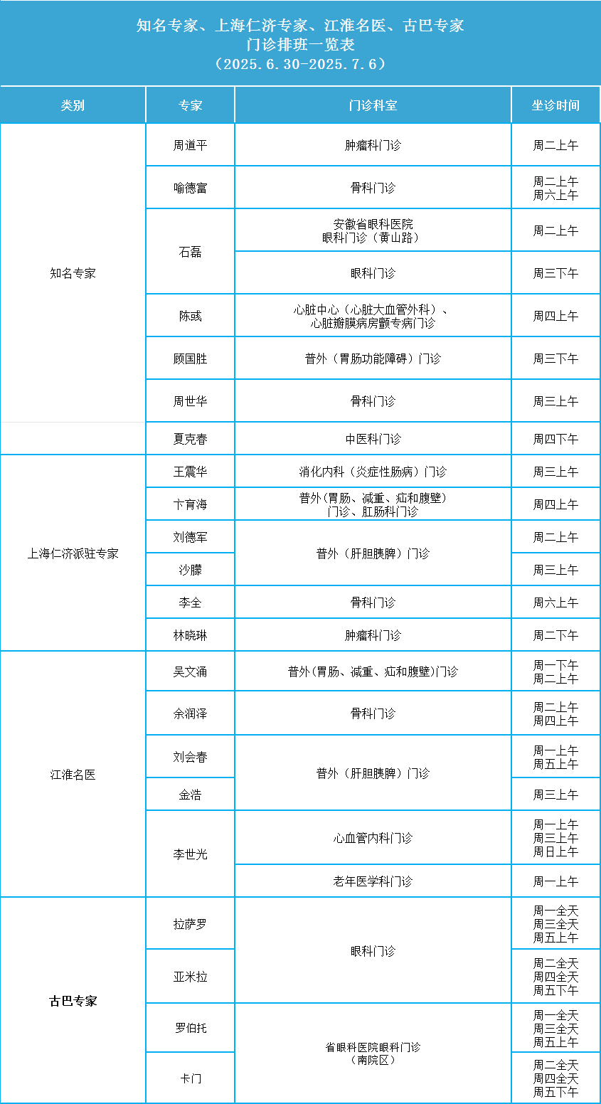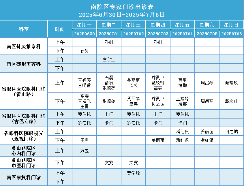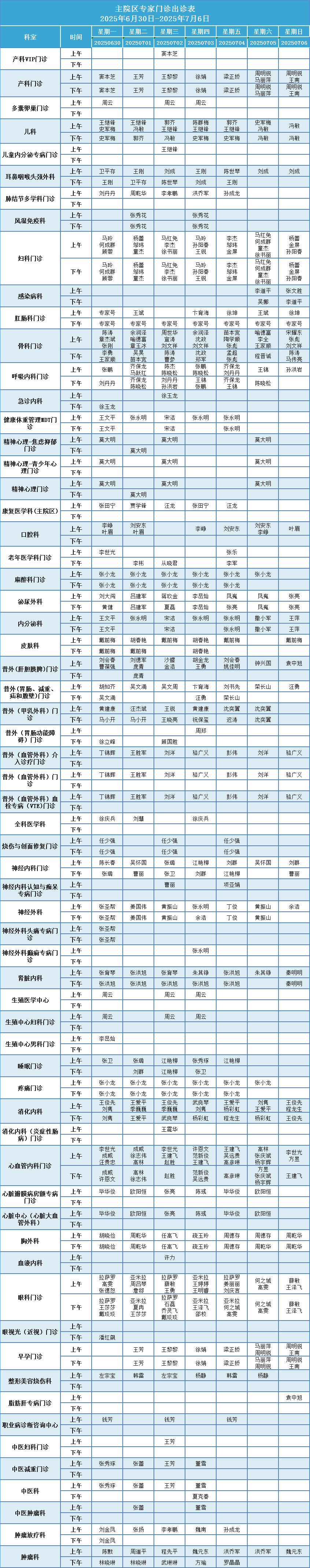 安徽省第二人民医院门诊一周排班表(2025年6月30日-2025年7月6日)
