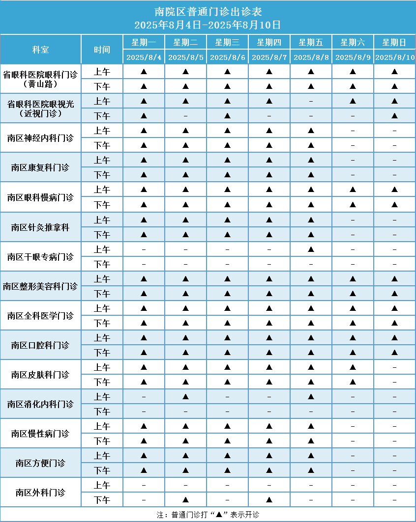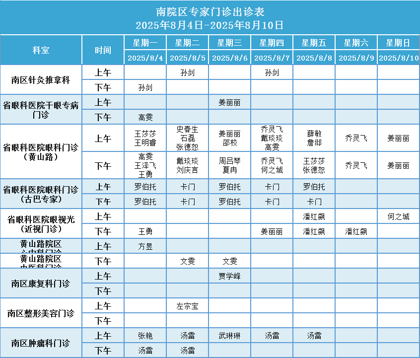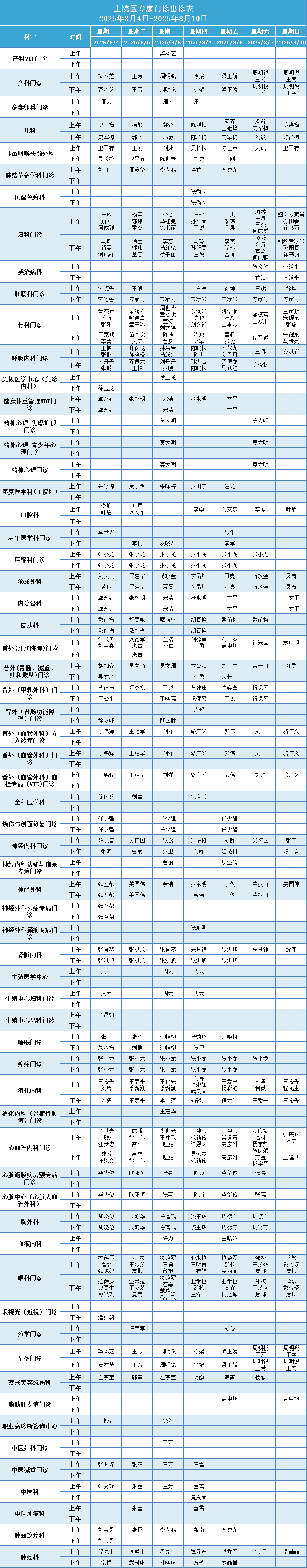 安徽省第二人民医院门诊一周排班表(2025年8月4日-2025年8月10日)