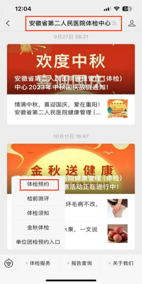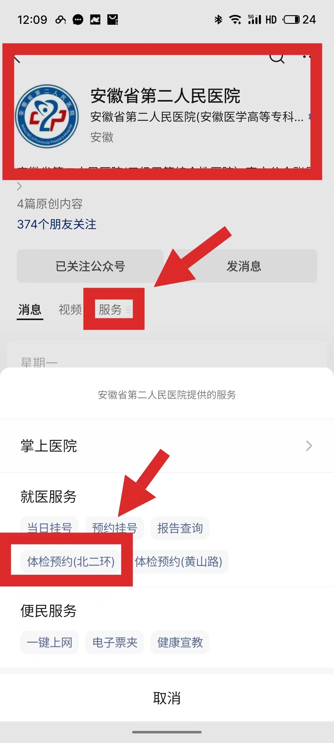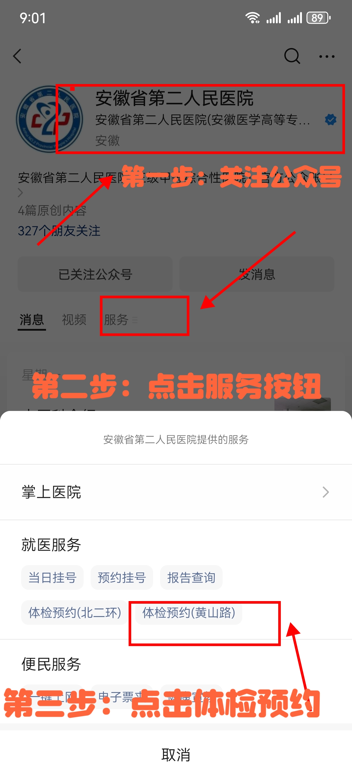 关注“安徽省第二人民医院”微信公众号,点击下方“服务”按钮,选择“体检预约(黄山路)”即可。具体操作可参考下图: