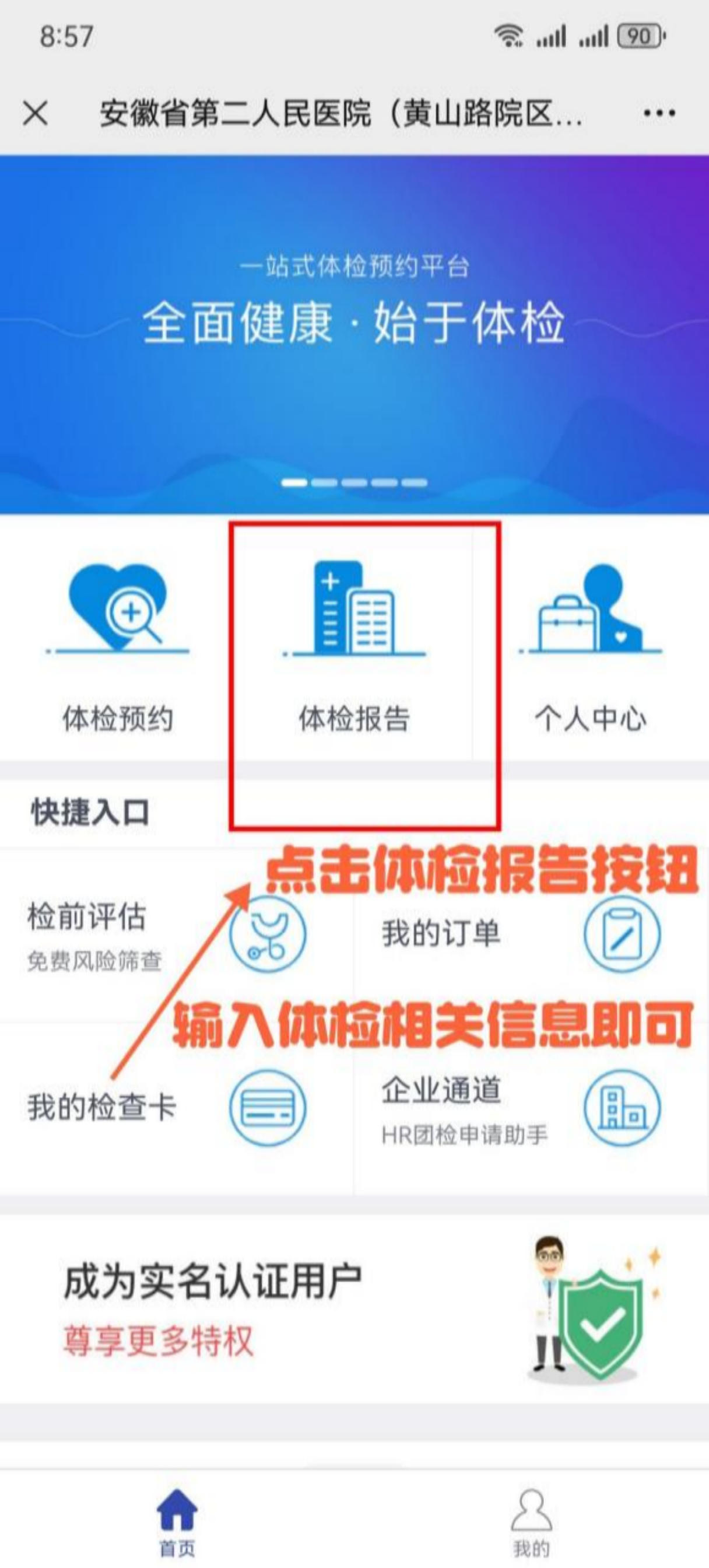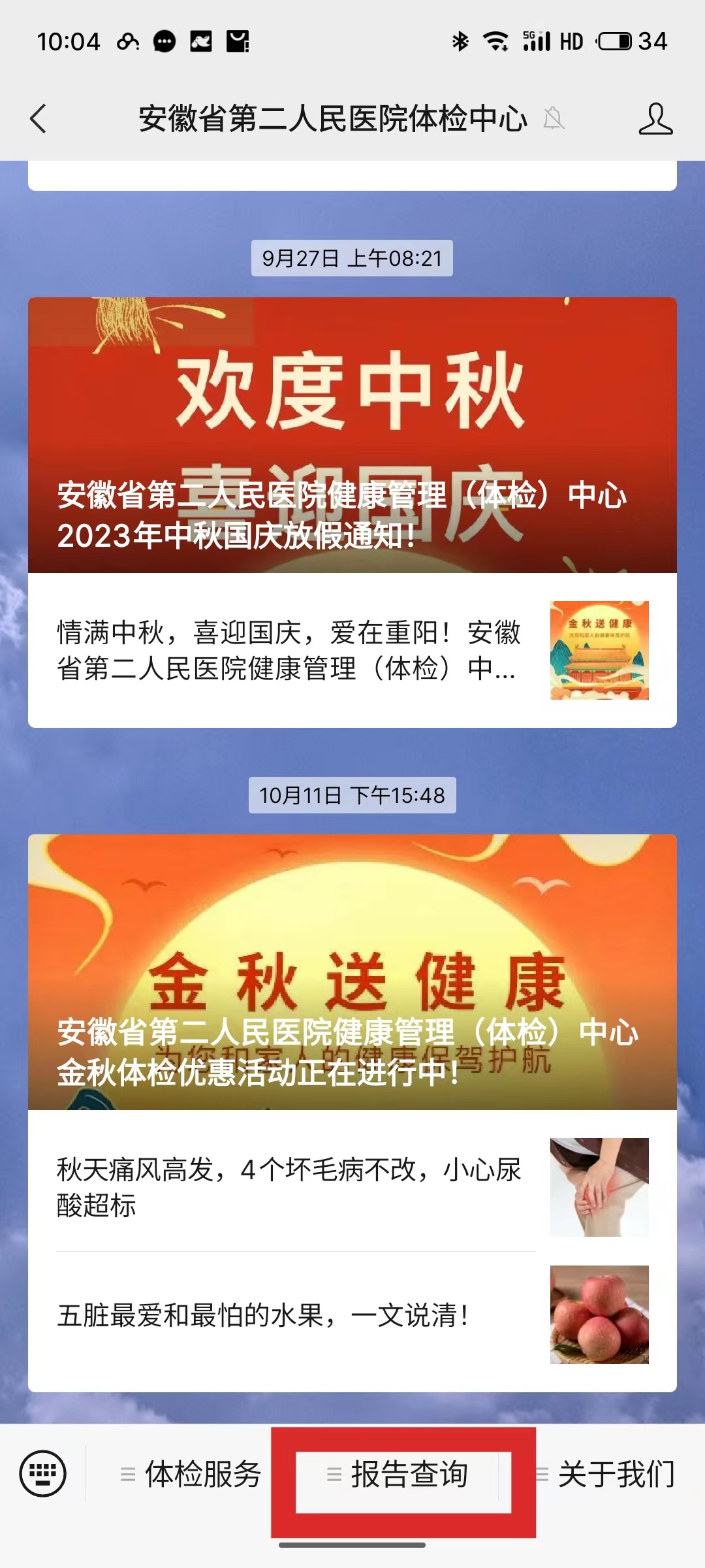 关注“安徽省第二人民医院”公众号,点击下方“服务”按钮,选择“体检预约(黄山路)”,然后点击“体检报告”,输入体检人相关信息即可查阅到体检报告。具体操作可参考下图: