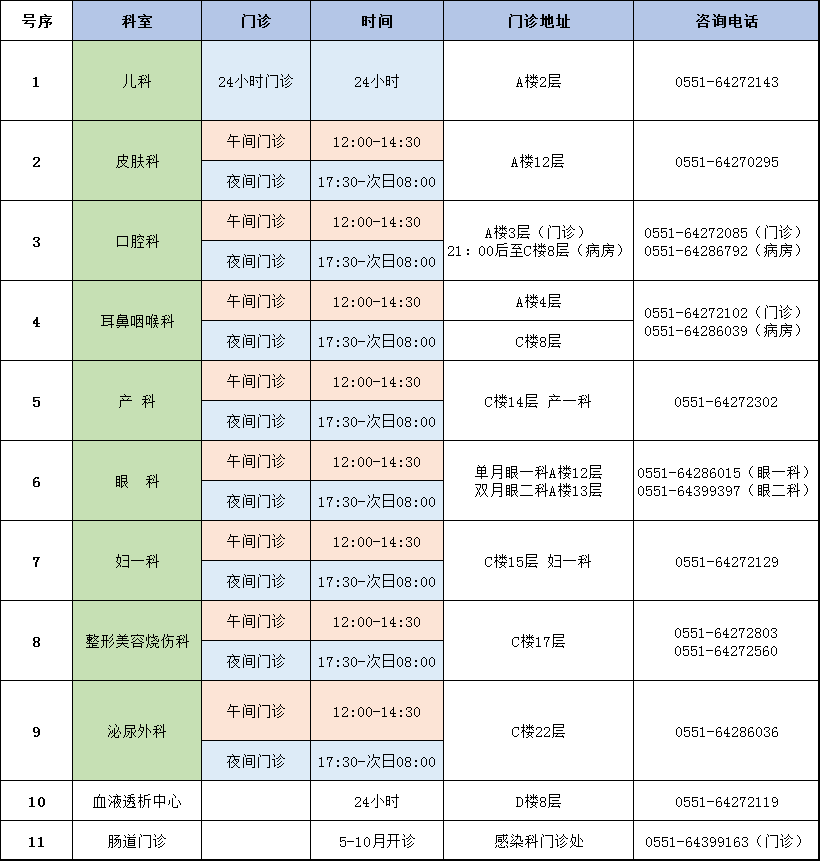 2.午晚间门诊时间:午间门诊:12:00-14:30,晚间门诊:17:30-次日8:00。