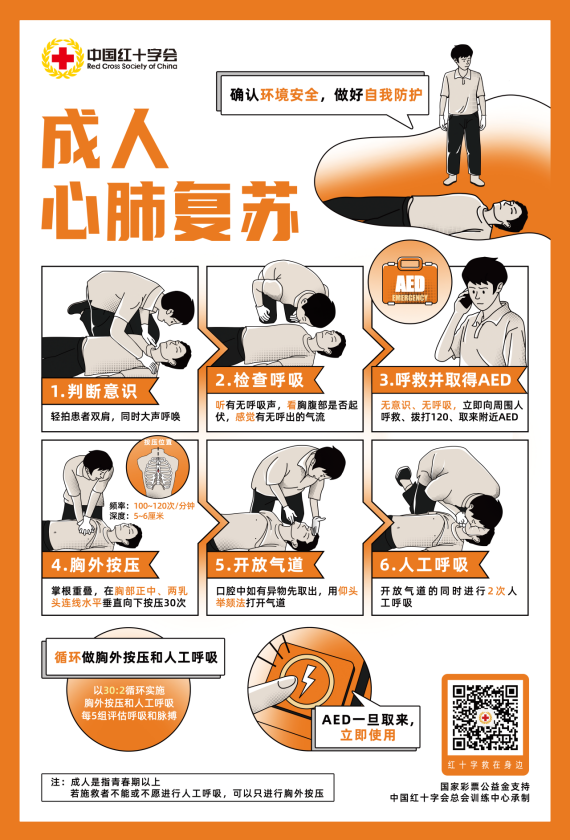 什么是应急救护?应急救护是指在突发伤病或灾害事故的现场,在专业人员到达前,为伤病员提供初步及时、有效的救护措施。这些救护措施不仅是对伤病员受伤身体和疾病的初步救护,也包括对伤病员的心理支持。 在日常生活中,意外时有发生,若紧急处理不当很可能造成更多伤害,甚至危及生命。正确掌握常用的急救知识,可以在突发情况下有效帮助别人或实施自救。掌握一些正确的急救知识,说不定哪天你也可以成为生命的守护者。 心肺复苏术:重启生命的节拍 一个人一旦发生心搏骤停,如果能够在一分钟之内识别并快速进行心肺复苏,现场抢救成功率可以达到90%以上,AED配合使用,施救成功率更高。 心肺复苏操作步骤: