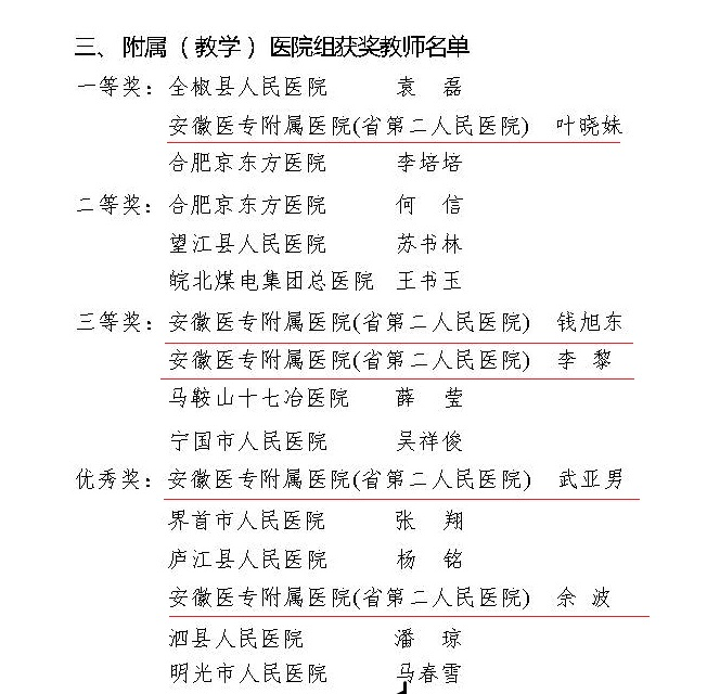 近日,医院叶晓妹、钱旭东、李黎等青年教师在安徽医学高等专科学校2024-2025学年青年教师教学基本功大赛决赛中荣获一等奖1项、三等奖2项,充分彰显了临床教师队伍过硬的教学素养和育人水平。