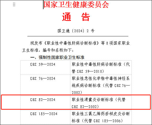 近日,由安徽省第二人民医院(省职业病防治院)牵头修订的国家标准《职业性滑囊炎诊断标准》和地方标准《职业健康检查工作规范》已于2024年正式发布。