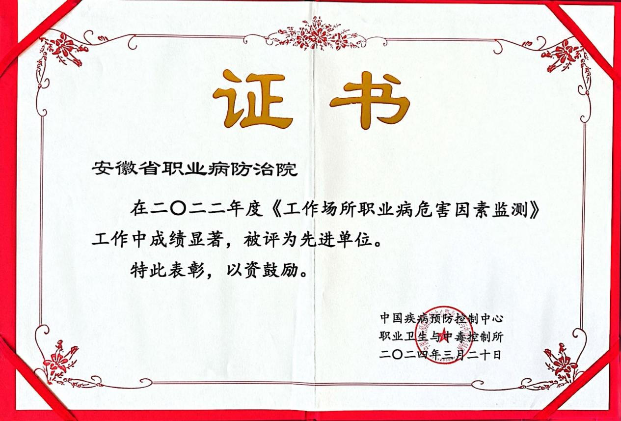 开幕式上对2022年度全国工作场所职业病危害因素监测工作先进单位颁发荣誉证书。安徽省职业病防治院等8家单位获此殊荣。