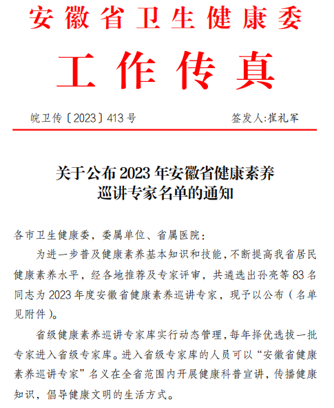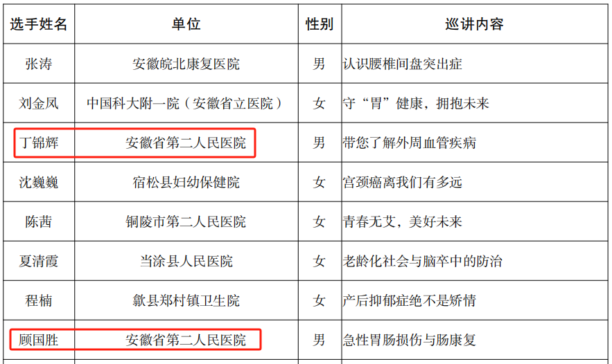 近日,在省卫健委公布的2023年度安徽省健康素养巡讲专家名单中,我院普外科胃肠功能障碍中心(六病区)主任、主任医师顾国胜、普外科介入与血管外科(五病区)主任、主任医师丁锦辉成功入选,成为省级健康素养巡讲专家。