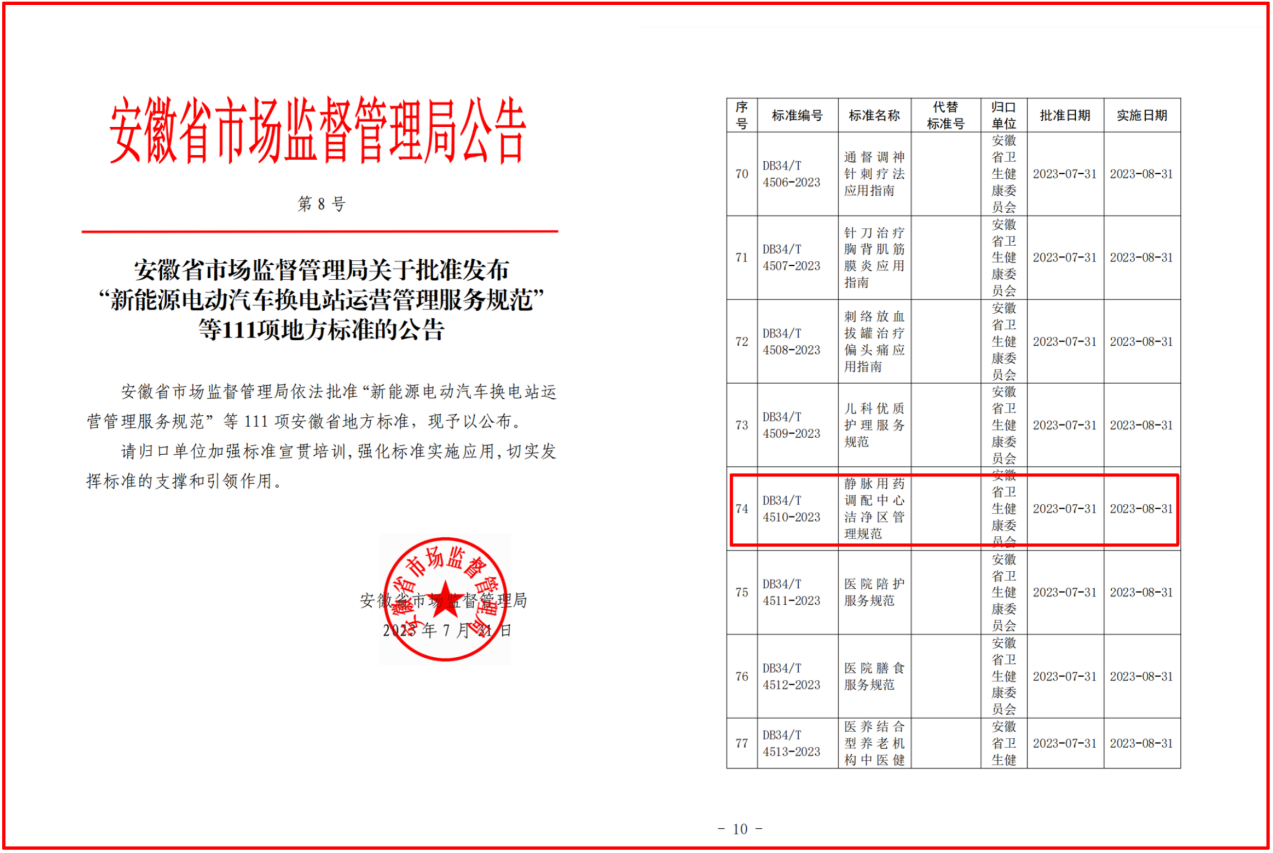 在安徽省市场监督管理局和安徽省卫生健康委员会的指导和帮助下,由安徽省第二人民医院牵头撰写的安徽省地方标准《静脉用药调配中心洁净区管理规范》(标准编号:DB34/T4509-2023)于2023年7月31日由安徽省市场监督管理局正式发布,自2023年8月31日起正式实施。本标准适应于安徽省各级各类医疗机构静脉用药调配中心的管理。