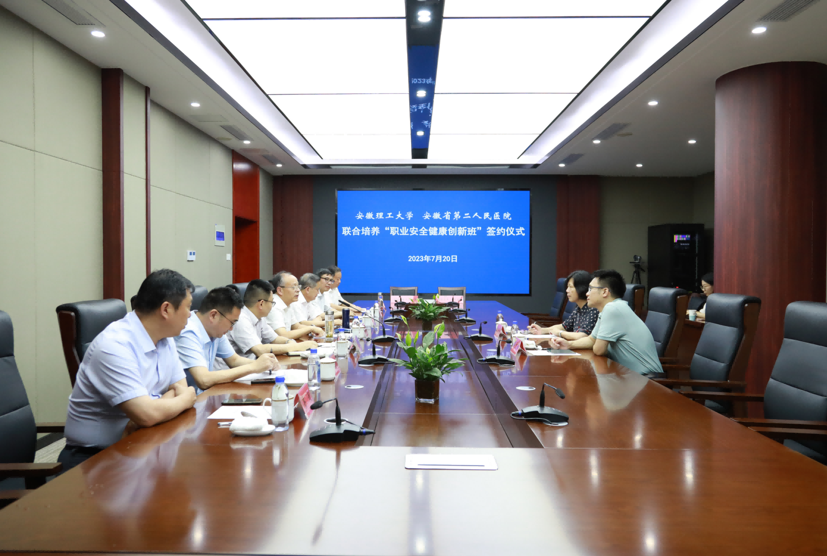 7月20日下午,医院与安徽理工大学举行联合培养“职业安全健康创新班”签约仪式。医院党委书记王卉晓、党委副书记、院长吴文涌;合肥综合性国家科学中心能源研究院丁立健副院长、胡浩民副院长;安徽理工大学党委书记郭永存,党委副书记、校长袁亮院士,党委副书记、常务副校长余玉刚,党委常委、副校长宫能平、鲁超出席签约仪式。