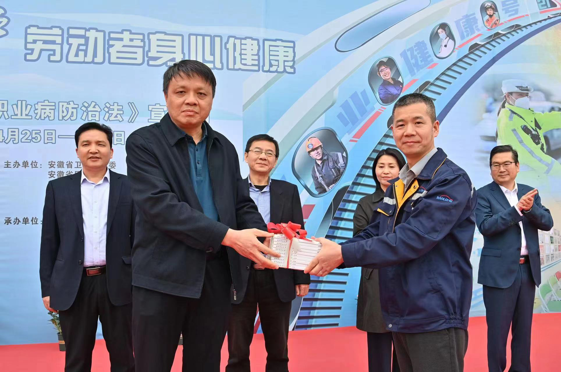 启动仪式上,周涛二级巡视员指出,全省职业健康工作坚持以习近平新时代中国特色社会主义思想为指导,认真贯彻落实《职业病防治法》,坚持把职业健康融入到卫生健康事业改革发展全过程,以新时代卫生健康工作方针为指引,以职业病防治规划为主线,坚持“五字”工作策略,深入实施职业健康保护行动,职业病防治体制机制不断完善,重点行业专项治理持续推进,技术服务和支撑能力明显提升,风险监测评估工作不断加强,职业病各项保障政策不断完善。但职业健康工作与当前经济社会需求相比,还仍有待进一步提升,要求各级各部门、各企业要充分认识严峻形势,加大工作力度,强化工作措施,要坚持以习近平新时代中国特色社会主义思想为指导,深入贯彻落实党的二十大精神,紧紧围绕健康安徽建设战略目标,努力在治理体系上进一步完善,在防治法治水平上进一步提高,全面推动安徽职业健康工作创新发展,努力开创工作新局面。仪式最后,余润泽副院长还代表我院向保隆(安徽)汽车配件有限公司捐赠《职业病防治300问》书籍,旨在维护劳动者健康权益,提升用人单位职业健康管理人员及广大劳动者职业健康意识。