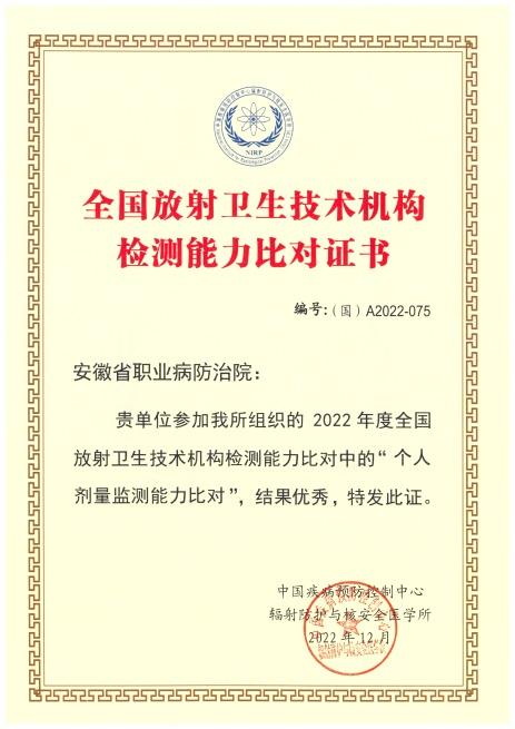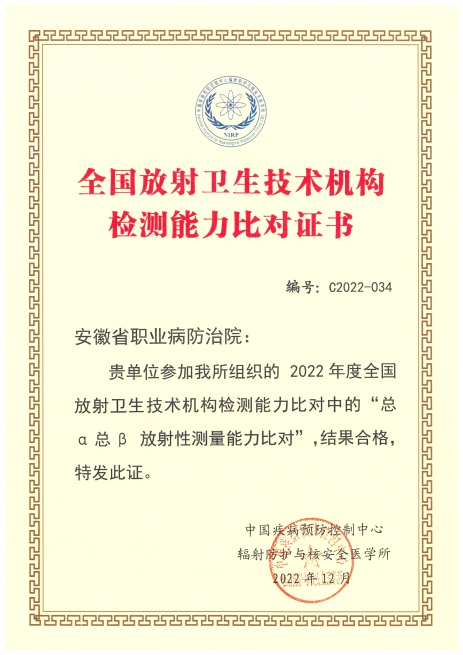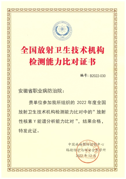 2016-2022年连续七年参加并顺利通过国家疾控中心辐射安全所组织的“个人剂量监测能力考核”,其中五次优秀,2022年首次参加“总α总β放射性测量能力”和“放射性核素γ能谱分析能力”考核,顺利通过,充分展现了省级放射卫生技术支撑机构过硬的专业技术能力和严谨的工作精神,在国家和全省建立了我院良好口碑。(职业卫生技术服务中心)
