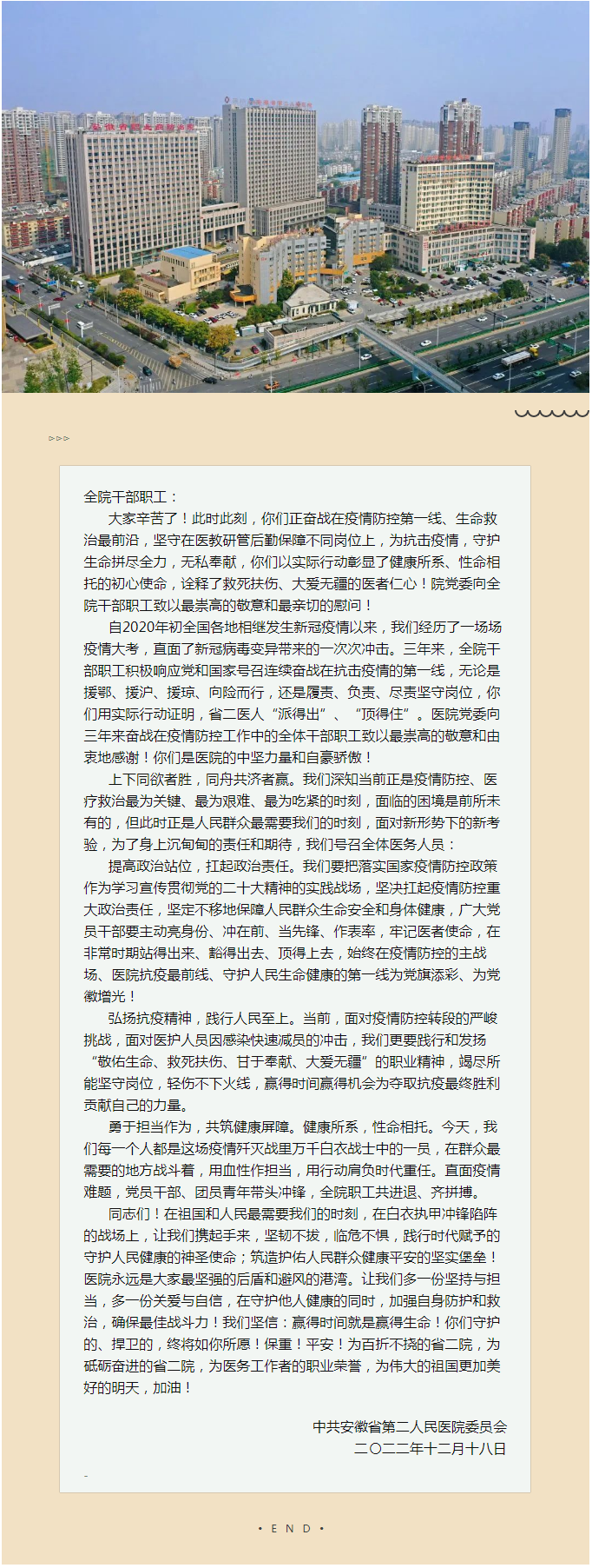 同心同向 共克时艰 战斗在党和人民最需要的一线——安徽省第二人民医院致全院干部职工的公开信