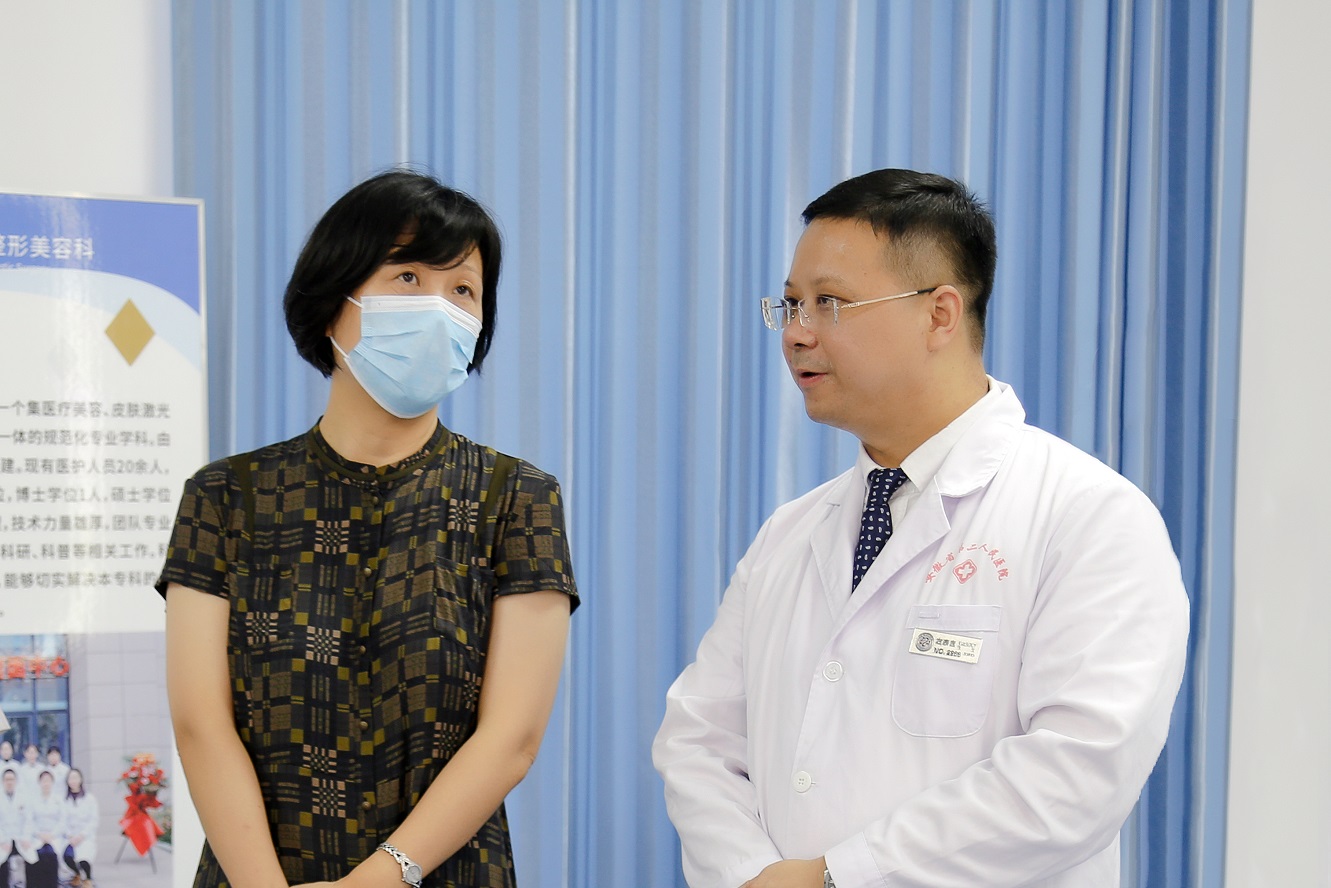 王卉晓一行先后参观了医学美容中心、康复治疗中心,听取了相关负责人关于科室建设情况的汇报,并就科室布局规划、设备配置、人员配备等方面提出指导性意见。她表示,医院将康复医学科、医疗美容科作为重点学科进行高品质打造,是为了更好满足人民群众日益增长的对美好生活、美丽人生的需求。黄山路院区经过整修和翻新后,院区环境焕然一新,能够更好地承接康复患者和医美人群。我院康复医学科、整形美容科技术力量雄厚,设备设施齐全,水平高、技术新、经验丰富。希望相关科室以今日开诊为契机,建强人才队伍,提升诊疗服务,用心为民服务,增加民生福祉,不断满足辖区群众对健康生活的美好向往。