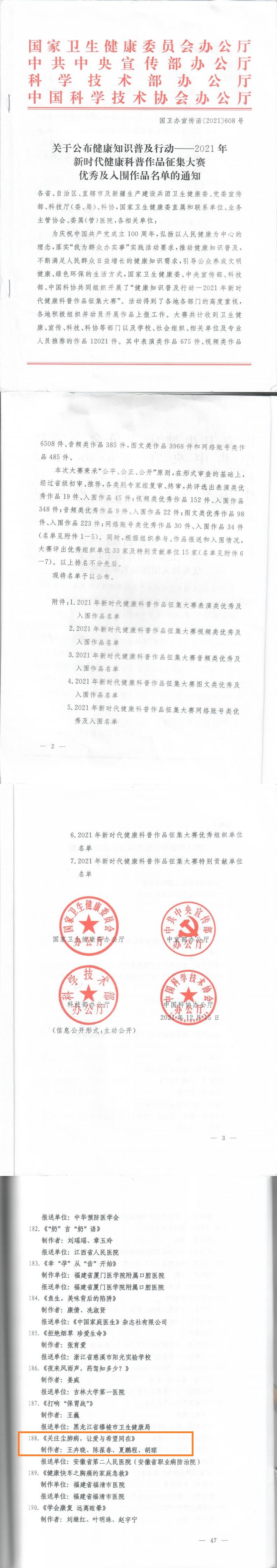 为庆祝中国共产党成立100周年,弘扬以人民健康为中心的理念,国家卫健委与中宣部、科技部、中国科协共同举办了“健康知识普及行动—2021年新时代健康科普作品征集大赛”。大赛共征集到31个省市(自治区)推荐的12021件作品,经过大赛评委形式审查、省级初审推荐、专家复审及终审,《关爱尘肺病 让爱与希望同在》入围新时代健康科普微视频类优秀作品。
