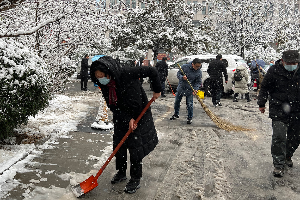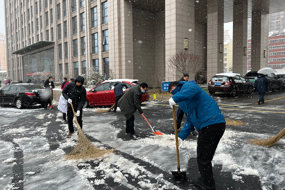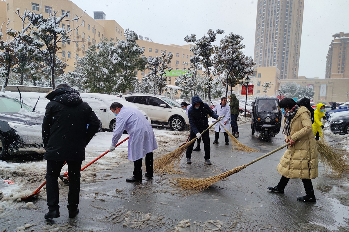 2月7日,春节假期后第一天,降雪如期而至,城市被雪花装扮的银装素裹,令人赏心悦目。雪景虽美,但也给人们的出行带来了安全隐患,尤其是来院就诊的患者。医院为确保患者就医安全,保证进出车辆安全通行,院党委书记王卉晓带领领导班子成员及行政科室人员第一时间开展积雪清除工作。大家分工合作,干劲十足,拿铁铲和扫把等清扫积雪的工具将院内主要交通干道积雪进行清扫,医院的角角落落活跃着大家忙碌的身影,为美丽的雪景增添了一抹靓丽的色彩。