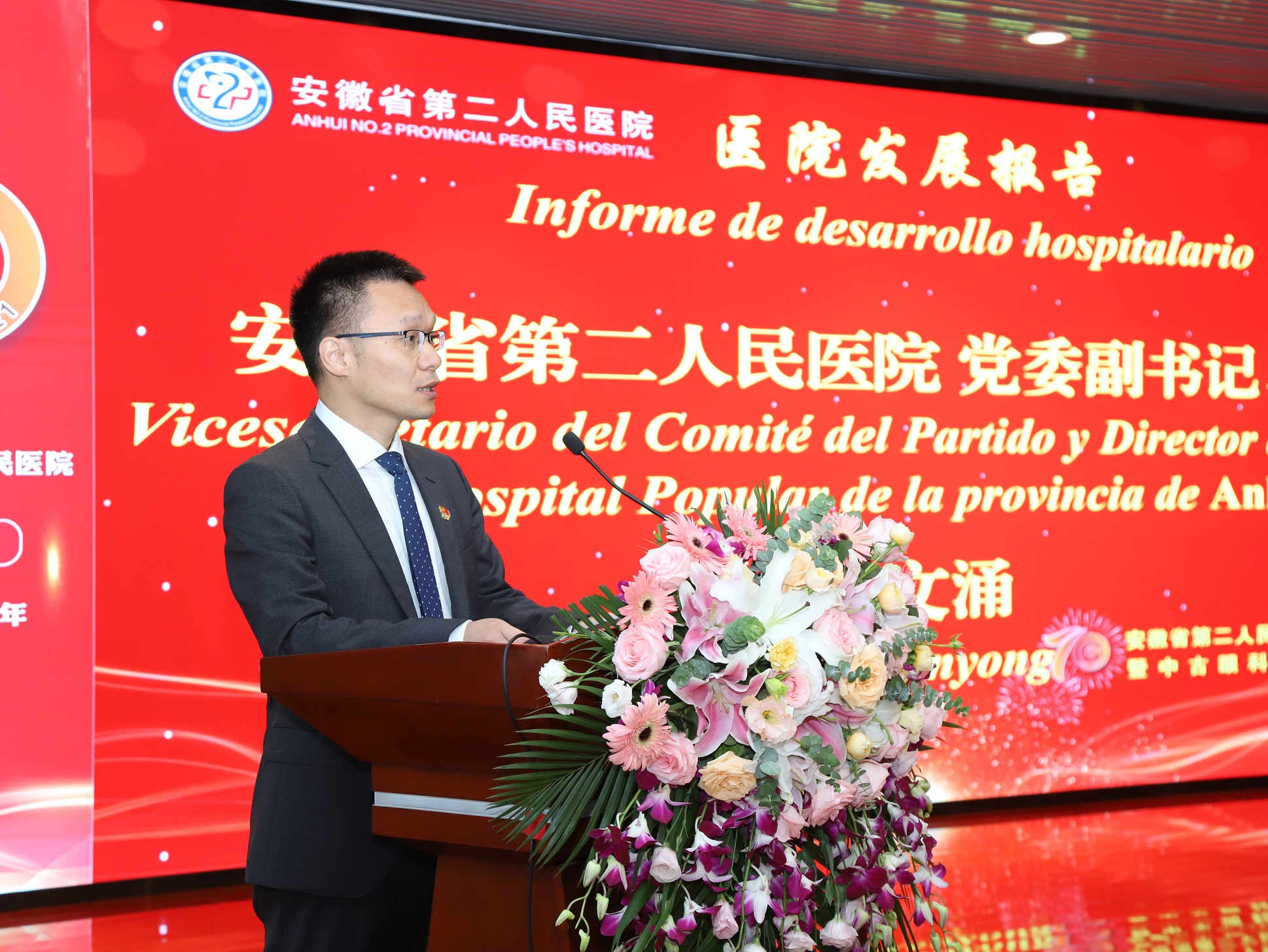 11月7日,医院建院70周年暨中古眼科合作10周年学术活动开幕式在C楼5层大会议室举行。安徽省政协副主席刘莉,安徽省卫健委党组书记刘同柱,古巴驻上海总领事托雷斯、上海交大医学院附属仁济医院党委副书记、纪委书记闵建颖出席开幕式并致辞。当天下午中国科学院院士赵国屏作专题学术讲座。开幕式由院党委书记王卉晓主持。党委副书记、院长吴文涌向大会作发展报告。