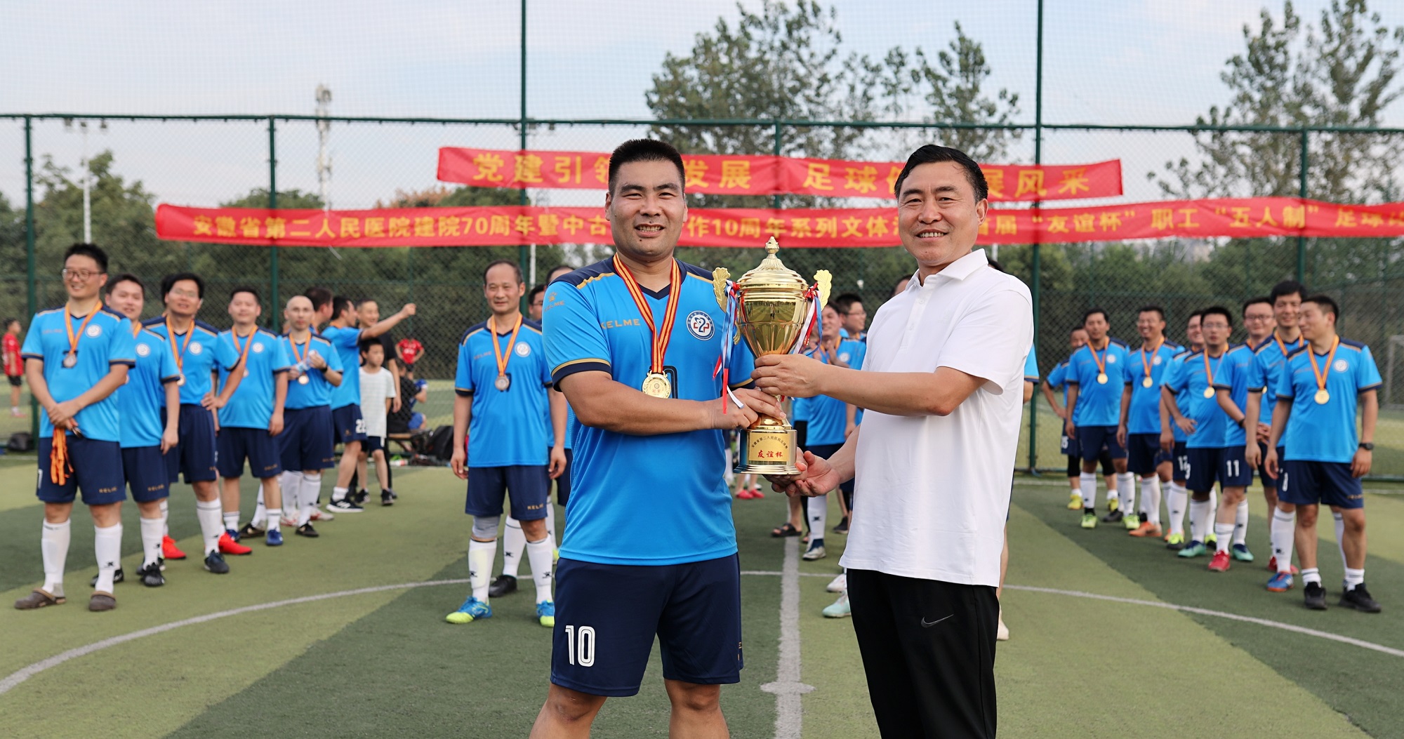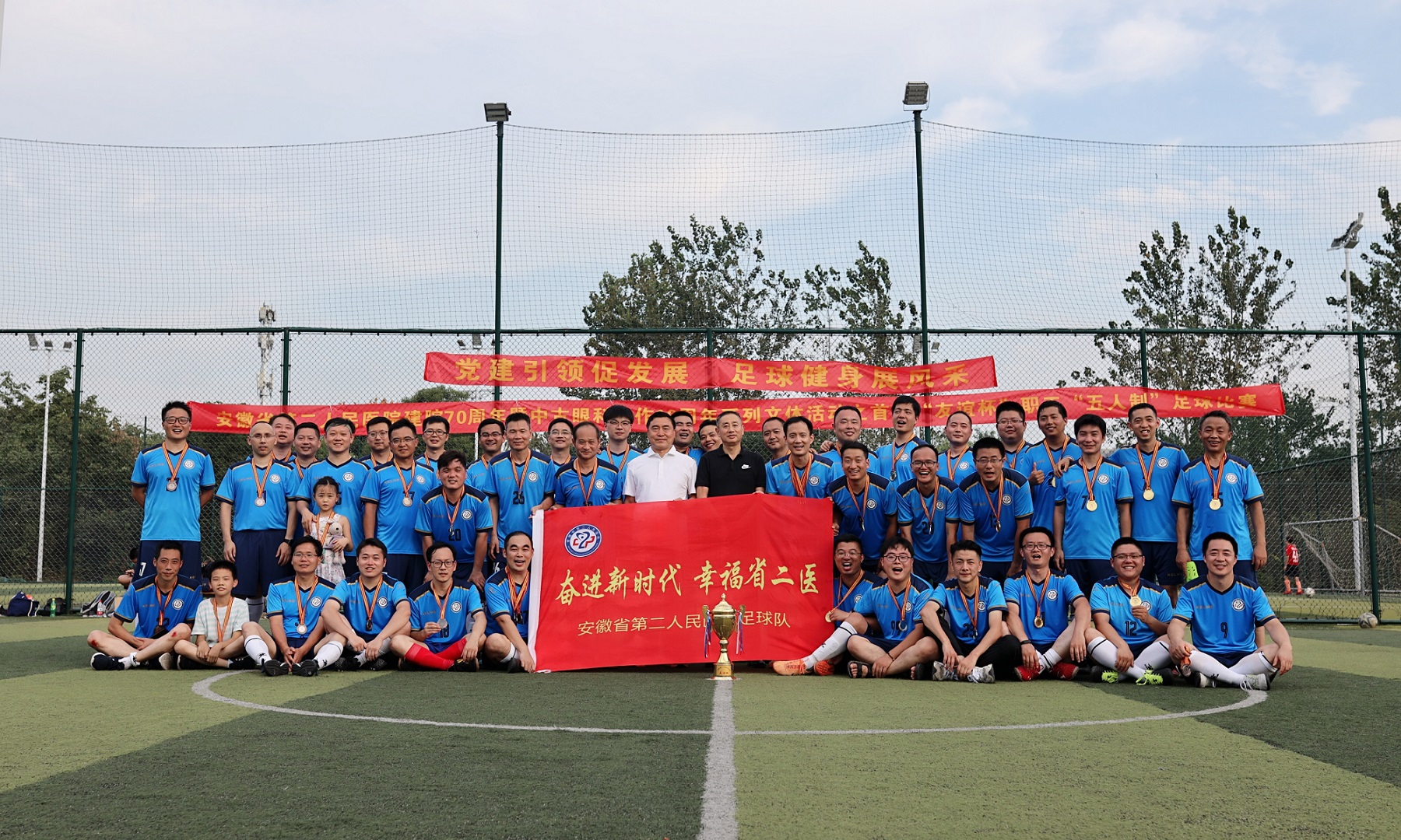金秋飒爽,丹桂飘香。值安徽省第二人民医院建院70周年暨中古眼科合作10周年之际,院工会于9月25日在林峰足球训练基地成功举办了“党建引领促发展,足球健身展风采”首届“友谊杯”职工“五人制”足球比赛。开幕式由工会副主席包广超主持,工会主席于琳娜致开幕辞,裁判员和运动员代表分别进行了宣誓。各队领队、运动员共五十余人参加了开幕式。