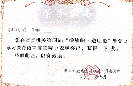 9月23日,省直机关第四届“举旗帜·送理论”微宣讲竞赛决赛在省直机关工委党校举行。我院组织人事部吴琳以《不负人民——健康脱贫办实事》为题的微宣讲荣获二等奖。宣讲视频将在安徽机关党建微信公众号等平台上推介。