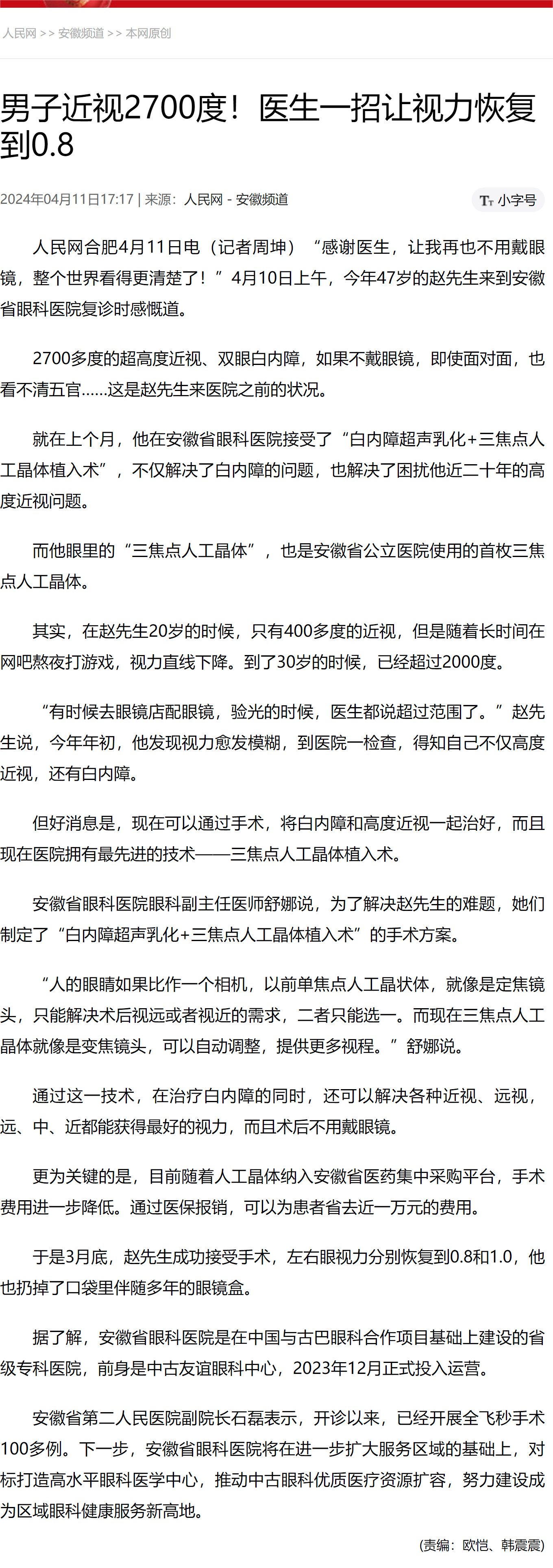 人民网丨男子近视2700度!医生一招让视力恢复到0.8