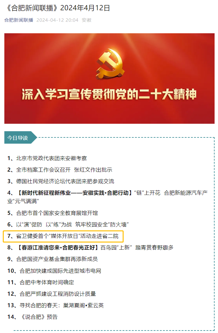 合肥新闻联播丨省卫健委首个“媒体开放日”活动走进省二院