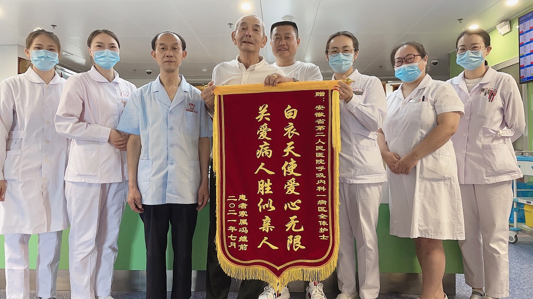 7月16日上午,呼吸内科一病区上演温馨了一幕:患者高大爷和家属手捧一面绣有“白衣天使爱心无限,关爱病人胜似亲人”字样的锦旗送给了呼吸一的全体护士,并再三再三感谢全体护士人员对他的精心护理和热心服务。