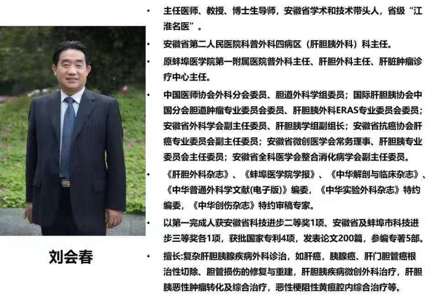 安徽省第二人民医院普外四科(肝胆胰外科),在学科带头人刘会春教授的带领下,科室目前可独立开展除肝移植外的肝胆胰脾外科所有常规治疗项目,项目技术齐全,常规手术水平居于国内一流、省内领先水平!科室特色项目包括:肝癌、胰腺癌、肝门胆管癌的根治性手术,胆管损伤的修复与重建,肝胆胰疾病微创外科治疗,肝胆胰恶性肿瘤转化及综合治疗,恶性梗阻性黄疸腔内综合治疗等。