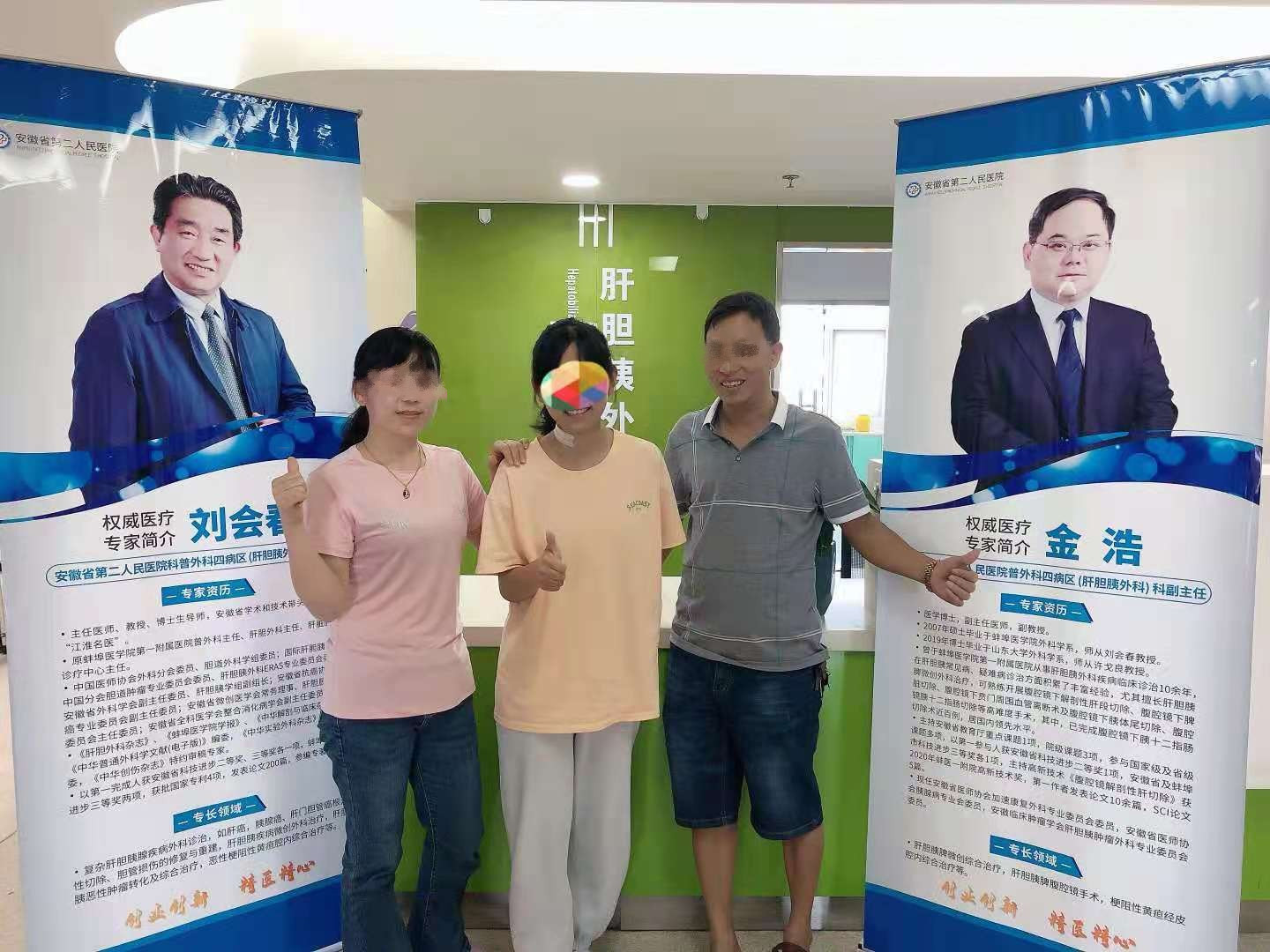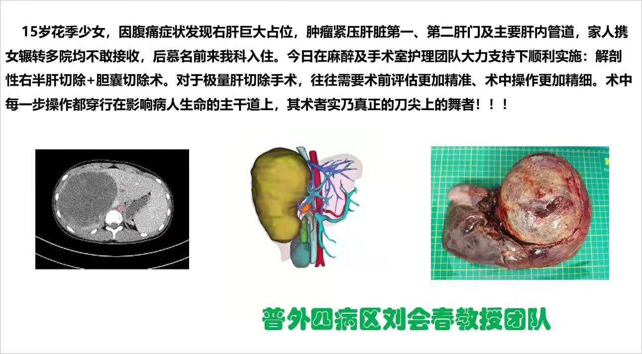 15岁花季少女黄某,近期突感上腹部饱胀不适感,因学习任务繁重一开始未予重视,一周前其突发上腹部疼痛症状,渐进加重,当地医院CT:肝脏巨大肿瘤,肿瘤最大径约17厘米,占据大半肝脏体积,经当地医院外科主任推荐慕名来到安徽省第二人民医院找到普外四科刘会春教授和金浩教授。两位教授仔细询问病史、查体及阅片后考虑为肝脏原发肿瘤伴出血,遂急诊安排患者住院治疗。后完善CT及三维重建等检查后发现:患者肿瘤占据肝脏近三分之二体积,压迫第一、第二肝门,紧压肝内主要血管、胆道系统。科主任刘会春教授认真分析后指出:患者肿瘤巨大伴有局部破裂出血,单纯介入治疗止血效果不确切且不能从根本上祛除病灶;患者为年轻少女肝脏代偿能力较强,其肿瘤虽大但主要位于右半肝,只要操作足够精准,剥离左肝主要管道,左半肝仍有保留可能,在祛除病灶后其仍有机会回归到正常生活中去。经与家人沟通并充分完善术前相关准备后,于2021.5.29顺利实施:解剖性右半肝切除+肝中静脉部分切除及修补+胆囊切除术。手术难度极大,但在麻醉科及手术室护理团队的保驾护航下最终按预期顺利完成。术后常规应用快速康复理念及相关技术,患者术后第2天便经口进食并开始下床活动,术后第7天顺利康复出院。