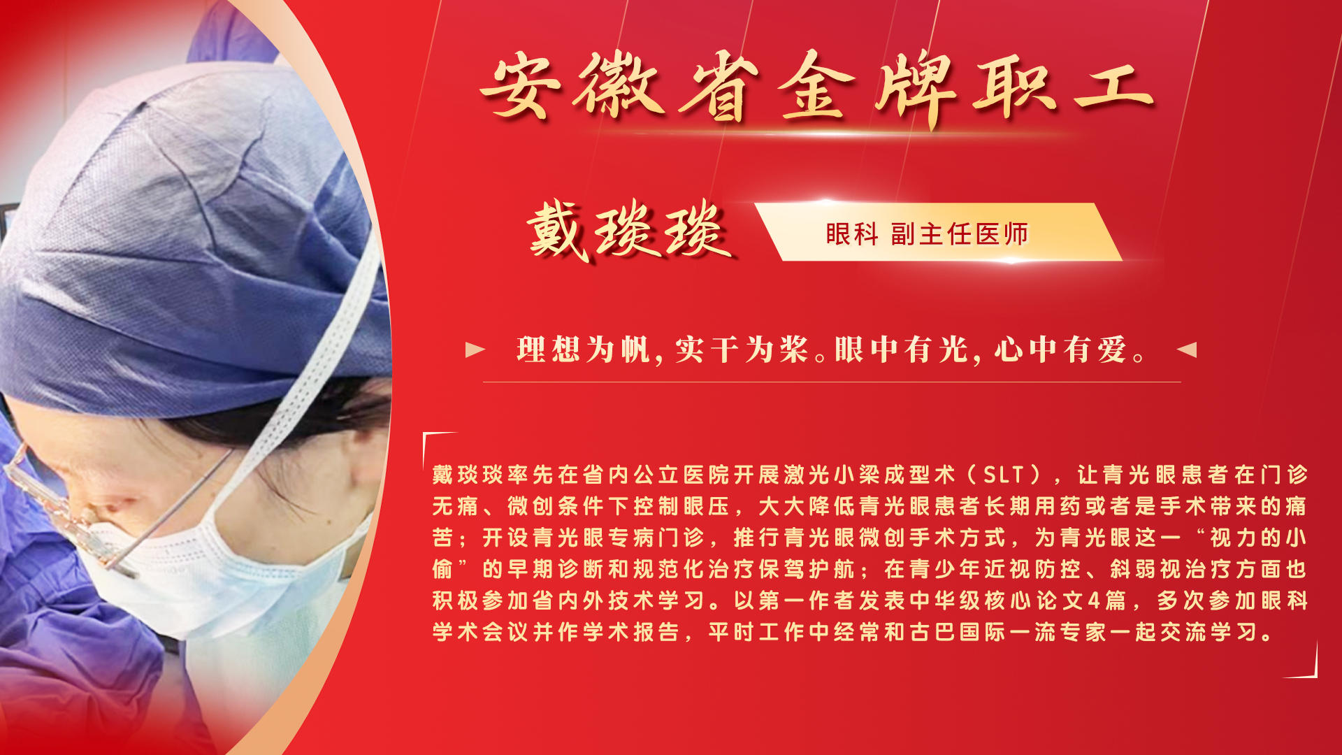 时间飞逝,转眼间戴琰琰副主任医师已在眼科工作15年了。在这些年里,她以十年如一日的坚守与创新,诠释着新时代青年医者的责任与担当。作为中共党员,她始终践行初心使命,以精湛医术、温暖服务和高尚医德,赢得了患者信赖与社会认可,2025年荣获“安徽省金牌职工”。