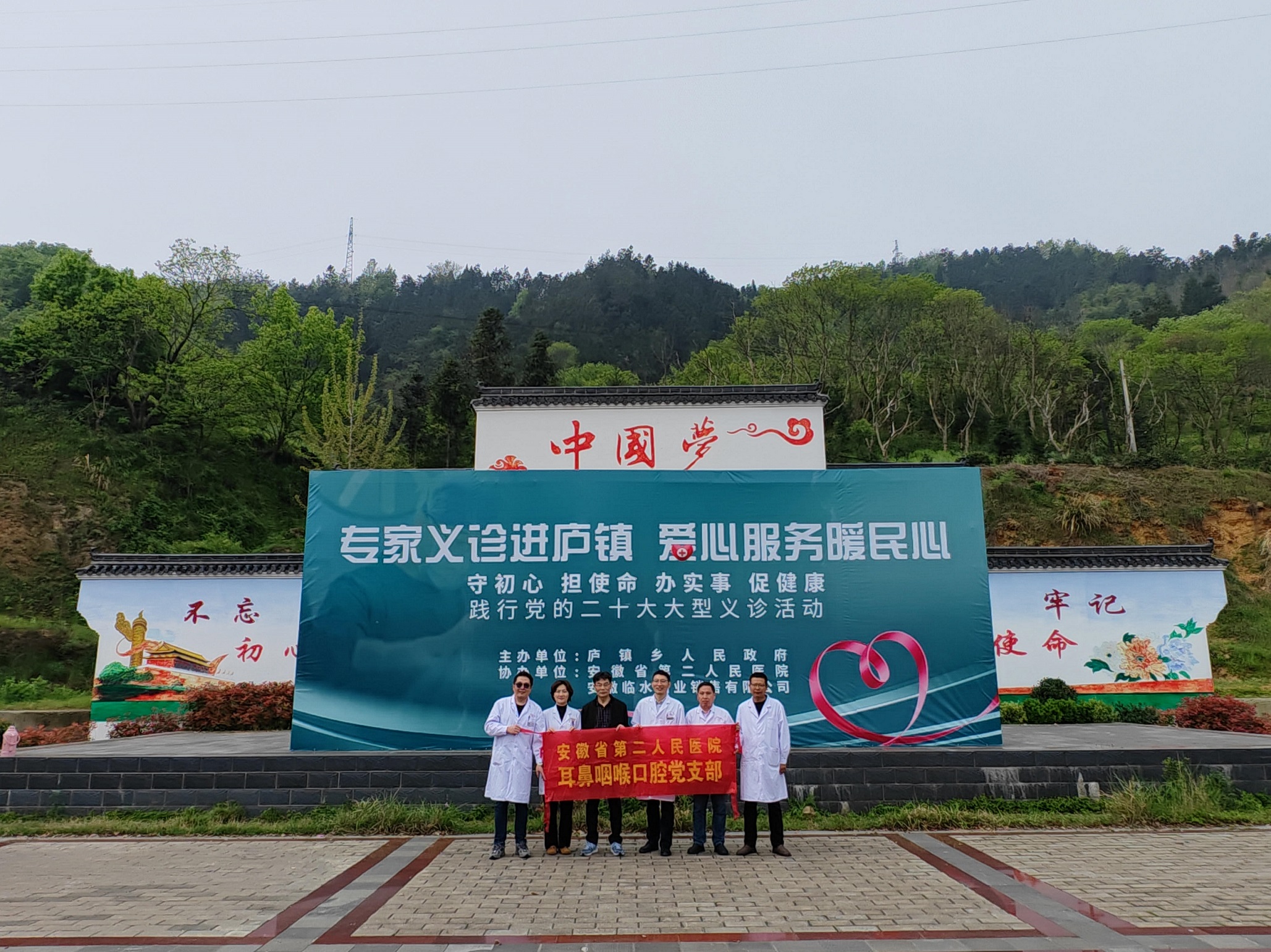 2024年4月13日上午,耳鼻喉口腔党支部及医院消化内科、眼科、胃肠外科、泌尿外科、骨科、神经内科等兄弟科室及其党支部,在院领导吕建军主任带领下,携带医疗物资深入大别山山区,在庐镇乡新时代文明实践广场为当地居民提供免费的大型医疗服务。这是由舒城县庐镇乡人民政府携手安徽省第二人民医院及舒城县庐镇卫生院、安徽临水酒业共同开展的“守初心、担使命、办实事、促健康、践行党的二十大