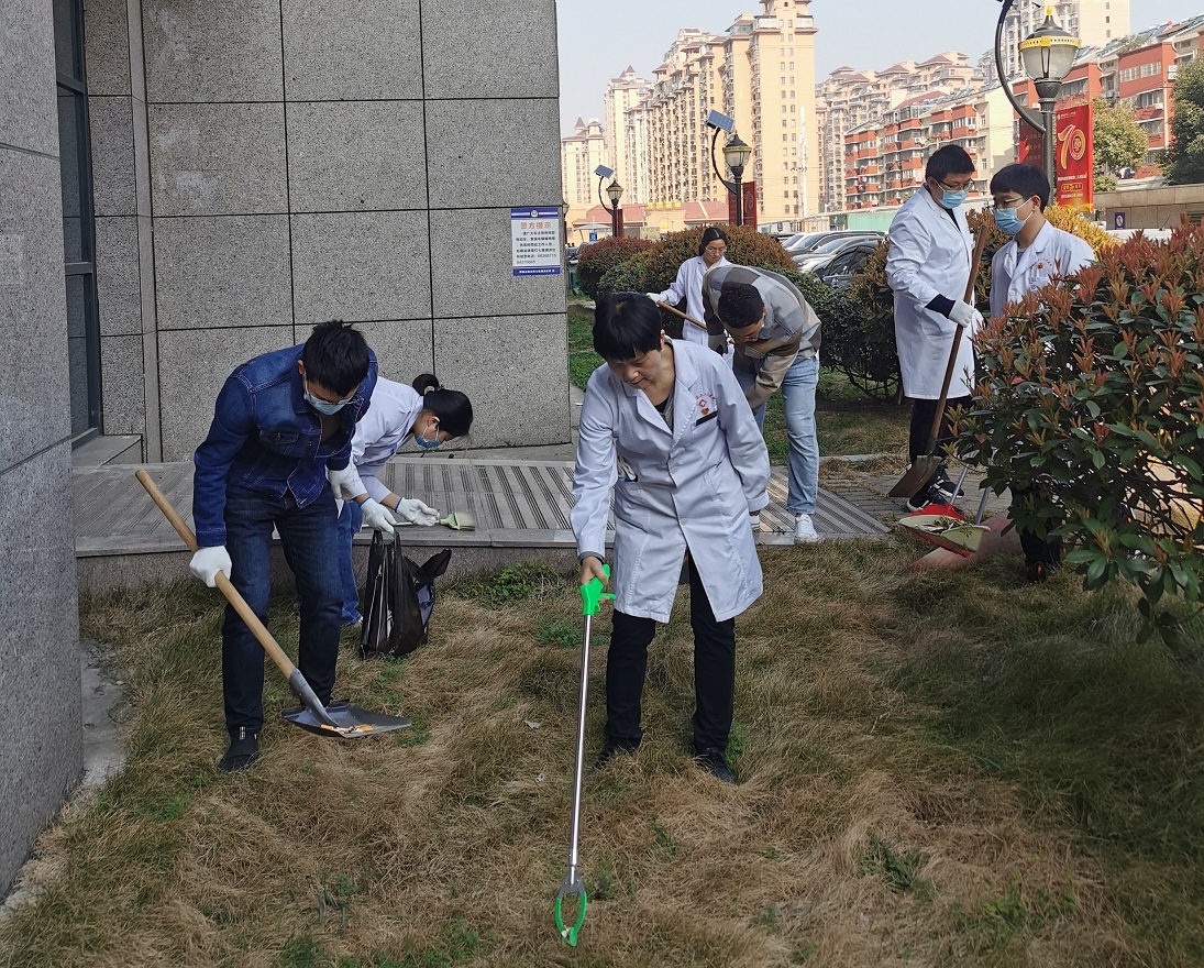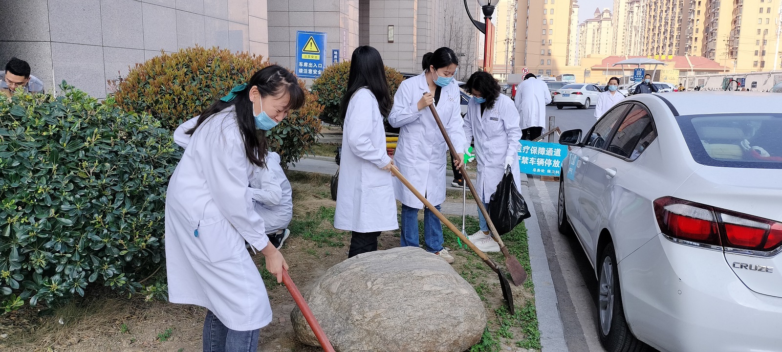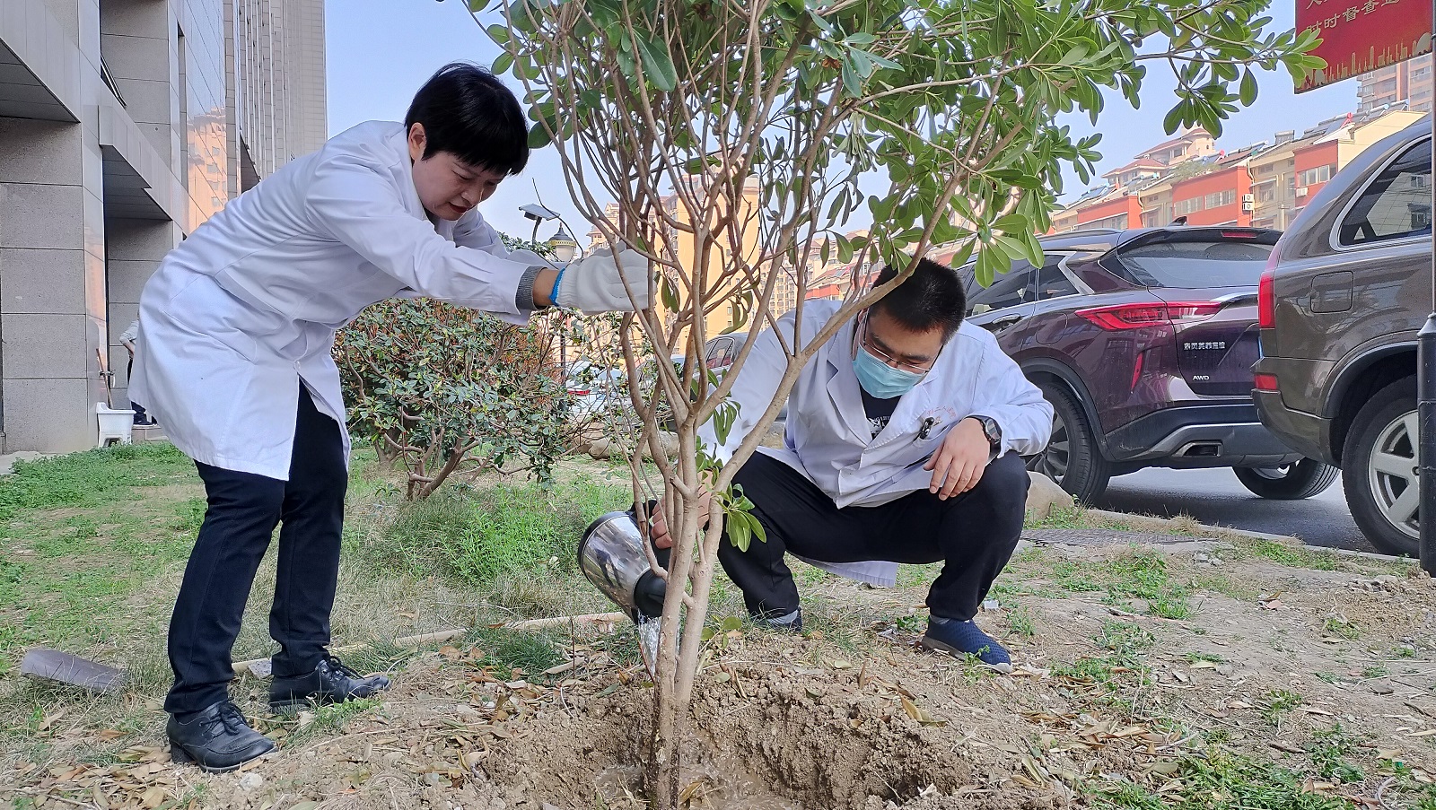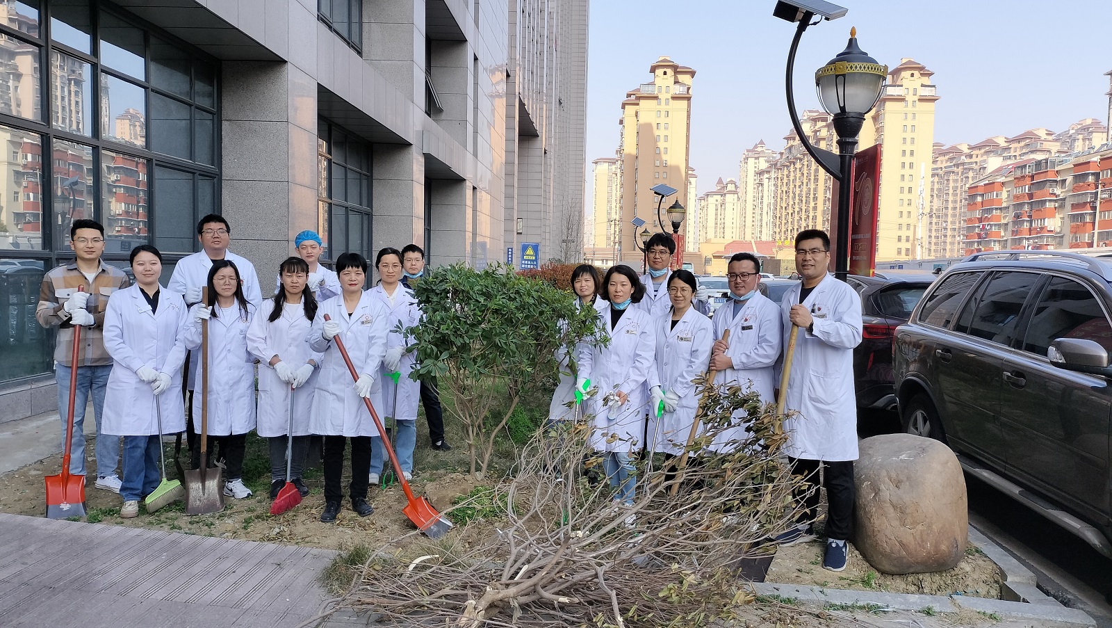 3月12日上午,教育科研党支部全体党员在支部书记邢桂枚的带领下前往医院C楼北面“娇艳苑”(教育处科研处花园)开展 “植树节”主题党日活动。