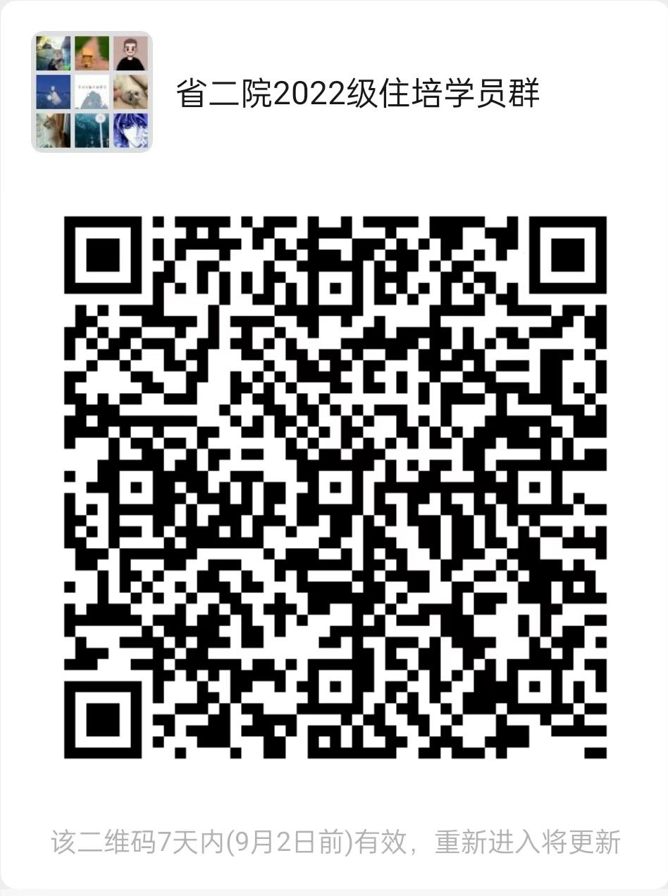 请各位学员提前加入“省二院2022级住培学员群”微信群(二维码附后),验证信息需写明真实姓名,入群后请将群名片改为“专业+真实姓名”。