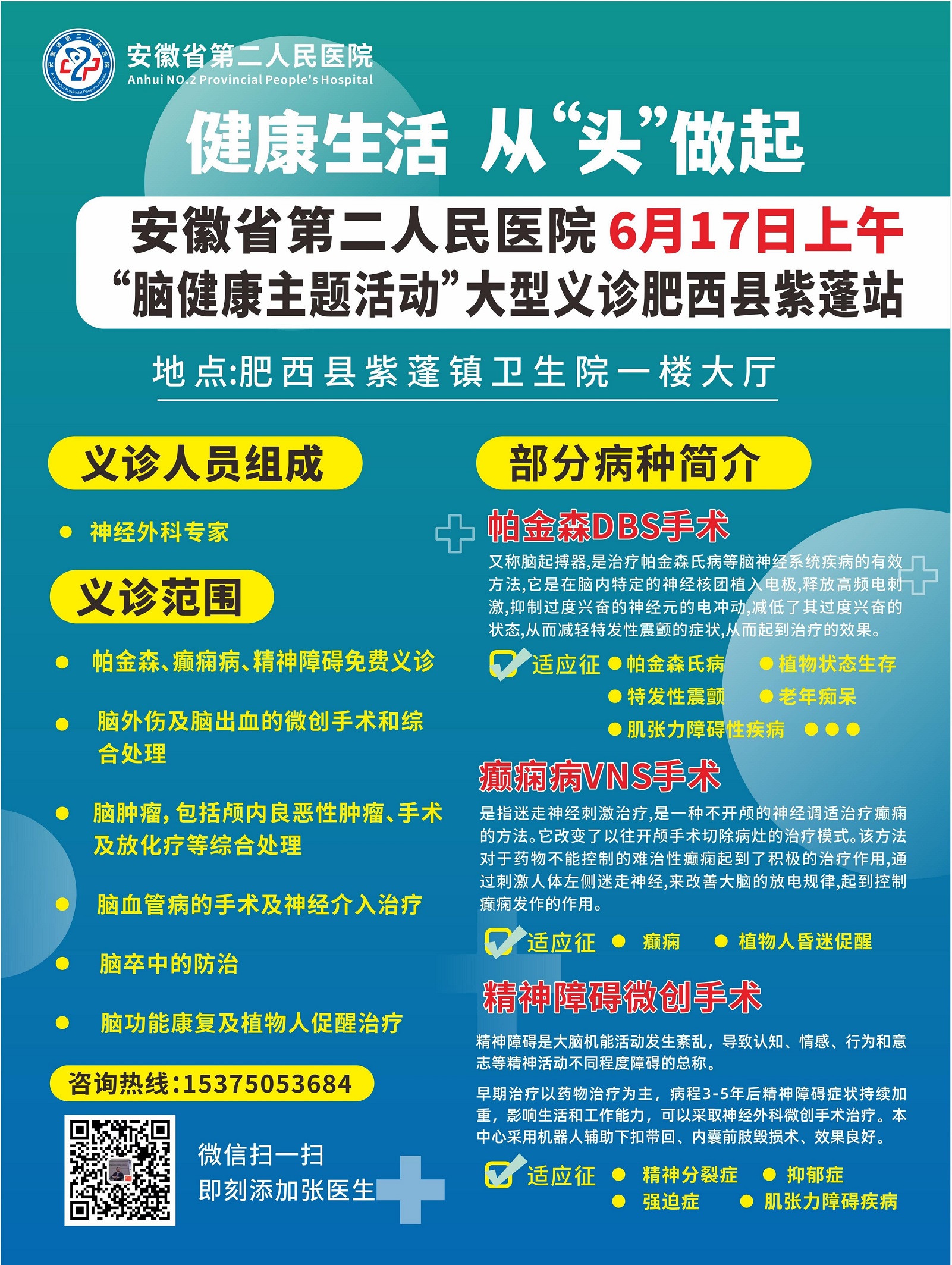 2022年6月17日上午安徽省第二人民医院携手肥西县紫蓬镇卫生院,共同举办“脑健康主题”大型义诊活动。届时安徽省第二人民医院神经外科的专家团将走进紫蓬镇给大家解惑答疑!欢迎广大病友寻医问诊。
