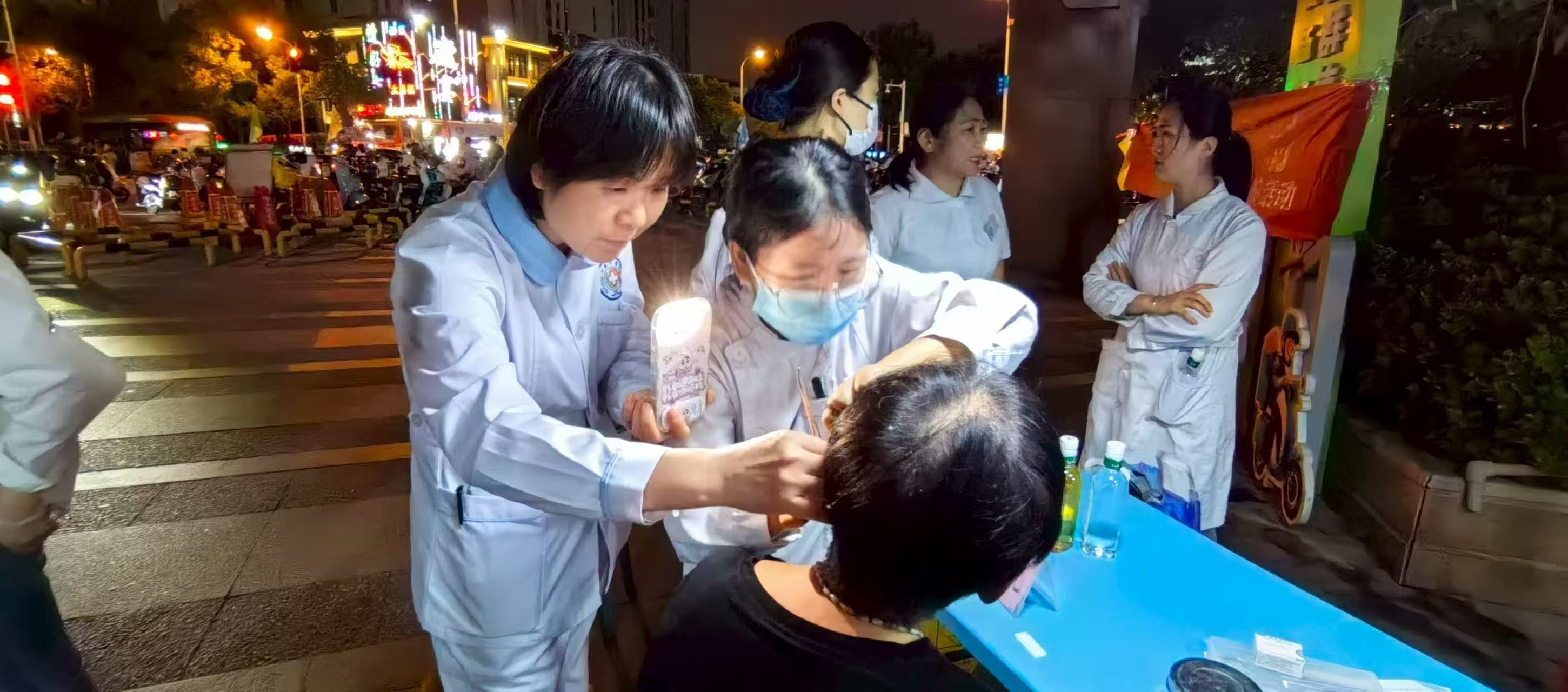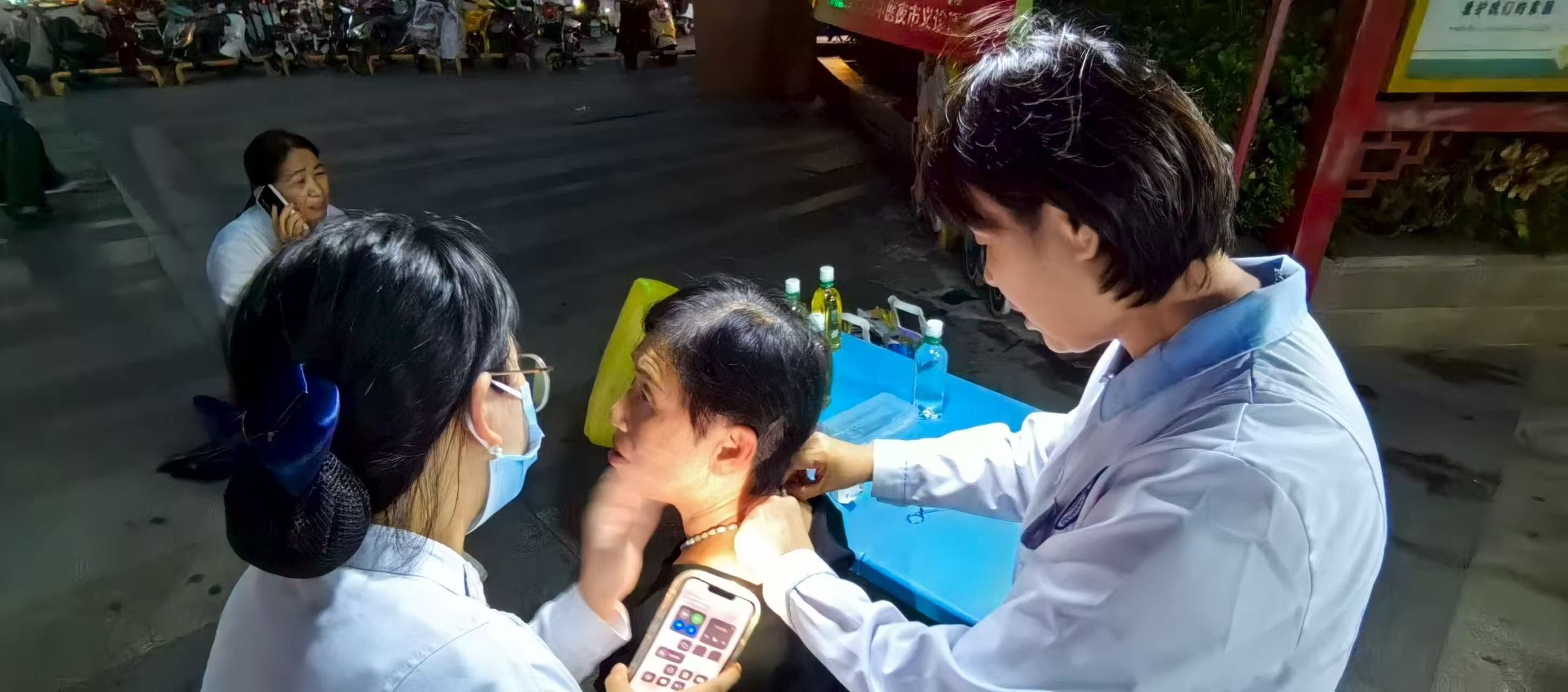 在夜市的义诊区,来自我院中医科的专家们通过望、闻、问、切等传统中医诊断方法,仔细地为每一位前来咨询的市民进行身体检查,耐心解答他们关于健康的疑问,并根据个人体质提供个性化的养生建议和治疗方案。