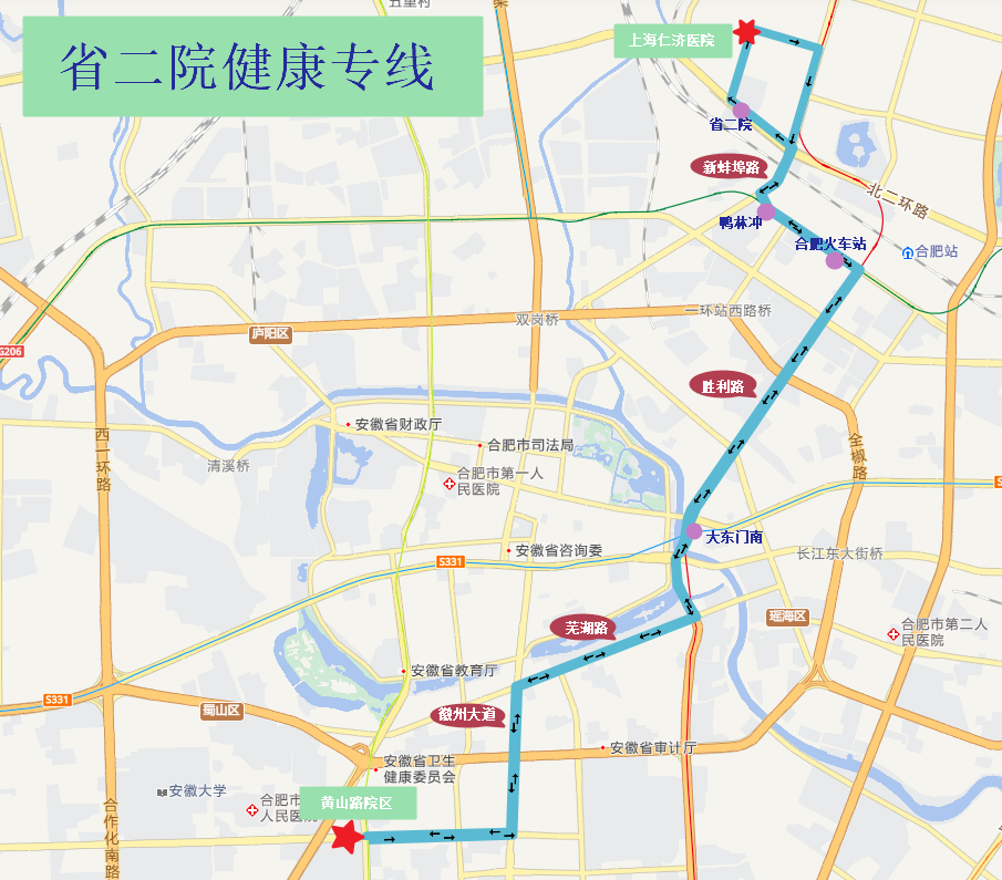 站点覆盖全,循环便捷。停靠站点包括:黄山路院区、徽州大道、芜湖路、马鞍山路、胜利路大东门站、火车站1号线、新蚌埠路3号线、北二环省二院、上海仁济医院安徽医院(循环线路),满足不同区域患者需求。